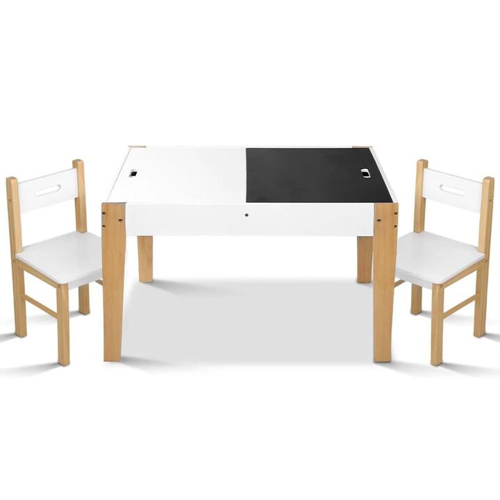 Kids need their own spaces to have unbridled fun. And our Kids Table and Chair Set is just the thing for them to develop their creativity and imagination in more ways than one. Made from eco-friendly MDF board and Pine wood, the entire ensemble is designed to last and be child-safe with non-toxic white paint, round corners and smooth edges. But best of all, the Table top can be converted from a normal table to a chalkboard desk in minutes. Simply lift up each half of the table and turn them over. It's convenient and opens up a new avenue for your children to draw, scribble and doodle to their heart's content. Better still, beneath the table are four compartments for easy storage of books, stationery and craft materials that your child may require from time to time. Certified to EN71 safety standards and perfect for any child three years and above, our two-tone Kids Table and Chair Set is a must for every parent who desires versatility from their kids's furniture. Features Contemporary and stylish design Durable and practical Eco-friendly and non-toxic paint Removable and reversible desktop Chalkboard desk option Four hidden storage compartments Chairs with air gap handle Kid-safe edges Sturdy construction Easy to maintain and clean Easy to assemble Recommended age: 3 years and above EN71 European Safety of Toys certified Specifications Material: MDF board and Pine wood Weight capacity: Table: 40kg, Chair: 80kg Single hidden storage compartment dimension: 42 x 27 x 7cm Table dimension: 90 x 60 x 51.5cm Chair dimension: 28 x 27 x 55cm Colour: White and Natural Package Content 1 x Kids Table and Chair Set 1 x Assembly Manual. Note:- Actual product colours may vary due to lighting, studio photography, room conditions, different screens on various devices. – All our furniture product are flat pack (assembly required) for safe handling purposes.