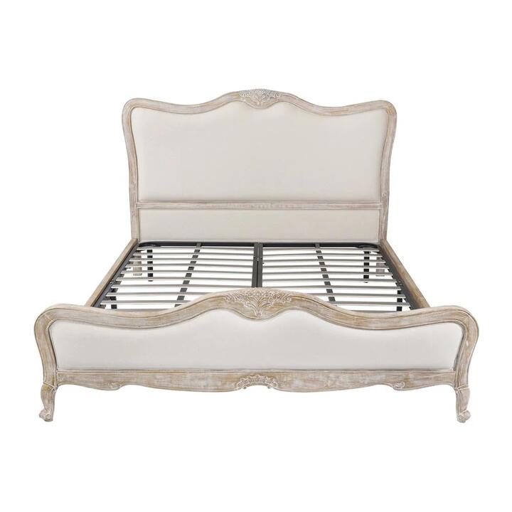 Refresh your room with this Marlen Mercedes bed frame, featuring Oak Wood frame with whitewashed finish. Whitewashed finish on wood brings timeless look whereas upholstered bedhead and footboard brings contemporary vibe in your bedroom. Lille bed is available in King and Queen sizes, so choose your convenient one and co-ordinate it with other furniture pieces from the Lille series. , Premium Upholstery Marlen Mercedes Bedframe has padded Headboard and Footboard, and these are completely upholstered in Linen Fabric. Linen is quite renowned as an upholstery material as it is comparatively resistant to wear and tear. It has been given a sober Beige colour which will bring a serene look in your bedroom. , Sturdy Construction Its frame is constructed of Oak wood that ensures the strength and sturdiness of the bedframe. , Convenient Its inbuilt mattress support is going to be very much convenient for a good night sleep. Besides, it is elevated with sturdy Cabriole legs which mount it firmly with the ground. , Key Features:, Classic Elegance Meets Contemporary Vibe in Lille Bedframe, Headboard and Footboard are Padded and Upholstered, Premium Quality Linen Fabric is Used in Upholstery, Strong and durable Oak Wood, Attractive White Washed Finish and Floral Design on Wood, Mattress Support Included, Home Assembly Required , Product Specification:, Product Dimension (cm):, Queen: ?L-214.5 x W-168 x H-140.5 King: L-214.5 x W-198 x H-140.5, Footboard Height: 65cm, Leg Height: 17cm, Ground to Slat Height: 30cm, Product Weight (kg): Queen- 74.2, King-83.6, Box Dimension (cm):, Queen: Box 1: L-175 x W-145 x H-10, Box 2: L-205 x W-17 x H-15, Box 3: L-200 x W-75 x H-3 King: Box 1: L-205 x W-145 x H-10, Box 2:L-205 x W-17 x H-15, Box 3: L-200 x W-90 x H-6, Box Weight (kg):, Queen: Box 1: 45.5, Box 2: 15.5, Box 2: 14.2 King: Box 1: 54, Box 2: 16.4 , Box 2: 14.2, Packaging Type: Flatpack, Images are for illustration purposes only. The colours may slightly vary from actual product. Free Shipping offer is applicable to VIC, NSW, QLD, ACT & SA Metro area only, additional shipping fee is required for delivery outside this area. Note:- Actual product colours may vary due to lighting, studio photography, room conditions, different screens on various devices. – All our furniture product are flat pack (assembly required) for safe handling purposes.