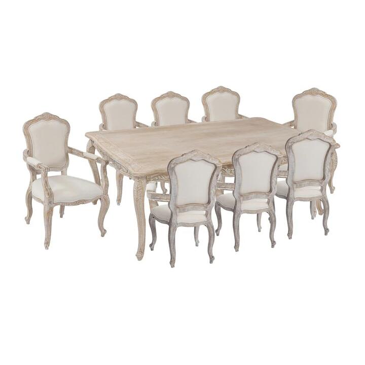 Our dining table exudes vintage look with its design and colour. Whitewashed finish on the dining table presents a timeless look that will stand out in any living room. The top of the table is enough spacious to meet your need. Upholstered Seat Lille armchair has comfy seat which is padded and upholstered by premium Linen cover. Again, it also has padded backrest unlike those which have only wooden structure to lean on. Hence, it would be very much comfortable as a dining chair too. Sturdy Construction Its frame is constructed of renowned Oak wood that ensures the strength and sturdiness of the dining chair. The wooden frame has been given whitewashed finish on it. Durability The edges of the upholstered seat are sealed with matching beige colour stiches. These make the item more durable besides making it look stylish. Convenience Lille armchair will come to you in fully assembled form. So, it would be a great relief for those who don't like the hassle of home assembly. Strong Structure This dining table is made of oak wood and plywood combination frame. Wood is the most versatile, renewable and sustainable resource on the planet. Wooden furniture has a life period which beats all other materials. They also tend to have good finishing and strong body. , Firm Support The Dining Table is elevated with sturdy wooden legs which mount it firmly with the ground. These also keep it high from the ground which enables you to clean away the dirt and dust underneath. Key Features:, Vintage Look with Floral Design on Wood, Use of Oak Wood Ensures Sturdy Construction, Tabletop is Sturdy Enough to Hold Any Item, Aesthetic Whitewashed Finish, Elevated with Firm Legs, Seat and Backrest are Fully Upholstered, Finest Linen Fabric Cushion with Minimal Design, Sturdy Construction with Oak Wood Frame, Whitewashed Finish Presents a Timeless Look, Has Wooden Armrest with Upholstery on the middle, Smart Packaging Ensures Safe Delivery, Product Specifications:, Dining Table, Product Dimension (cm):, Medium: L-180 x W-110 x H-78 Large: L-220 x W-110 x H-78, Product Weight (kg): Medium-44, Large-51, Box Dimension (cm):, Medium: L-185 x W-115 x H-20 Large: L-225 x W-115 x H-20, Box Weight (kg): Medium-44.4, Large-51.8, Packaging Type: Flatpack, Dining Chair, Product Dimension: L-65 x W-65 x H-105cm, Box Dimension: L-108 x W-58 x H-75cm, Product Weight: 12.5kg (1pc), Box Weight: 25kg, Packaging Type: Flatpack, Images are for illustration purposes only. The colours may slightly vary from actual product. Free Shipping offer is applicable to VIC, NSW, QLD, ACT & SA Metro area only, additional shipping fee is required for delivery outside this area. Note:- Actual product colours may vary due to lighting, studio photography, room conditions, different screens on various devices. – All our furniture product are flat pack (assembly required) for safe handling purposes.