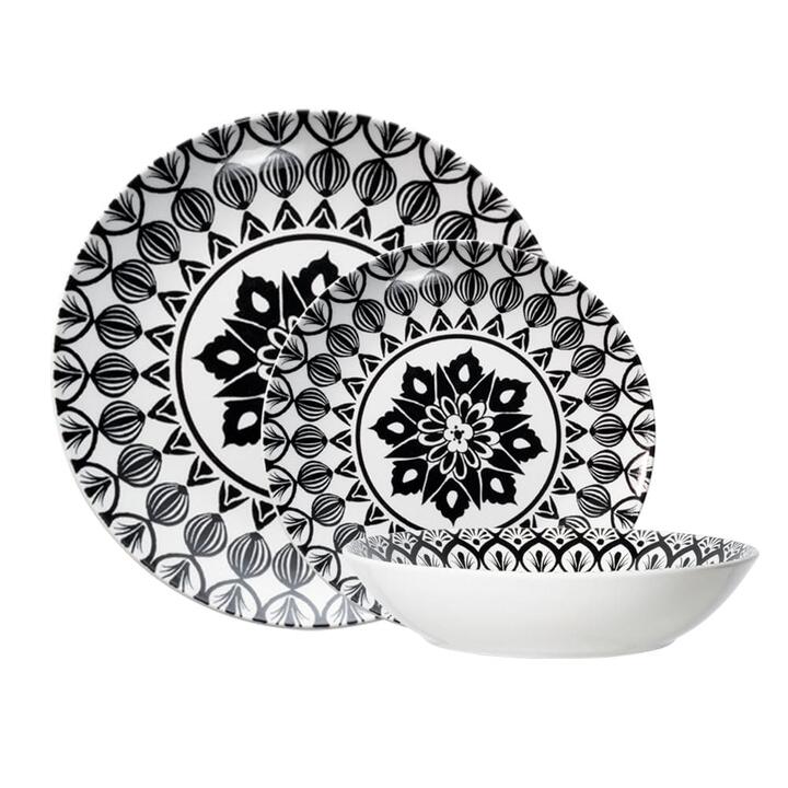 The timeless Ambrosia Lena II 12 Piece Dinner Set Black is sure to bring style to any dining occasion. The Ambrosia Lena II Dinner Set is a great way to upgrade your dining experience. This set provides a refined touch to the table and is suitable for both casual everyday meals and formal celebrations. It is composed of high-quality porcelain for long-lasting durability and appeal. With its unique Aztec black and white pattern, this dining set is a fantastic backdrop for your wonderful culinary delights. It has nicely designed plates that are perfect for plating your masterpieces and can comfortably accommodate a group of four. The Ambrosia Lena II 12 Piece Dinner Set, presented in a nice box, makes a great gift for housewarmings, birthdays, and other special occasions. Features • An eye-catching Aztec design provides a lovely backdrop for your delectable culinary creations • High-quality porcelain construction ensures long-lasting durability and classic charm • Set includes 4 x Dinner plates, 4 x Side plates, 4 x Bowls • A classic black and white colour combination • Beautifully designed plates and with deeper bowls • Perfect for both casual everyday dining experiences and formal occasions • Presented beautifully boxed and makes a delightful gift for housewarmings, birthdays and other special occasions What Am I Buying • 4 x 26.5cm Dinner plates • 4 x 19cm Side plates • 4 x 20cm Bowls Material Porcelain