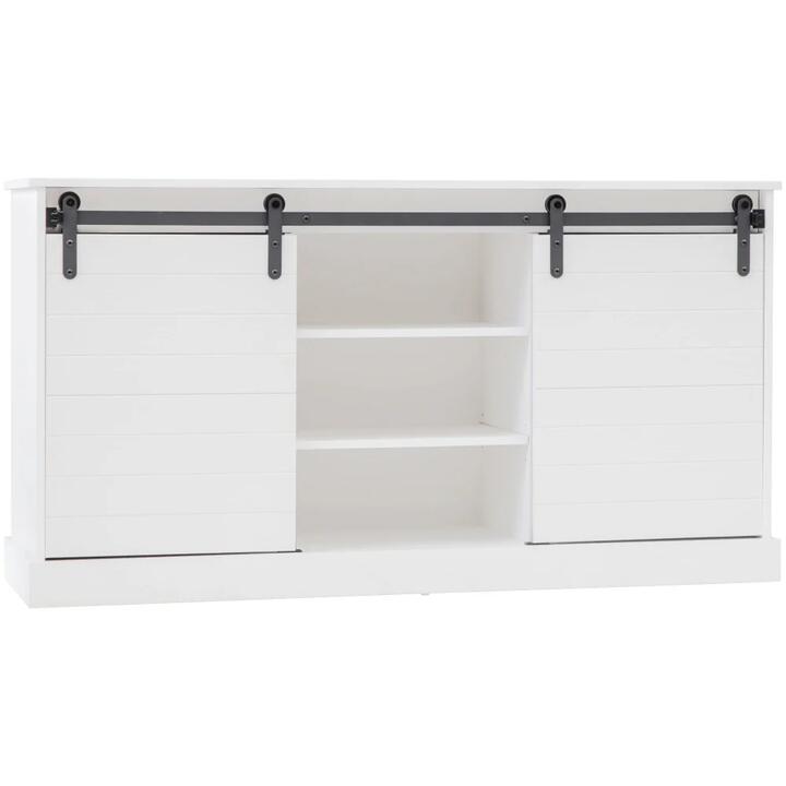 The Liberty 2 door buffet is a perfect addition to compliment any home interior. Featuring 2 barn-style sliding doors with internal adjustable shelving, it will provide sufficient storage for all your home decor and accessories. The 3D scratch resistant Wood-Look white Laminated finish gives a modern fresh look to your living space. Please note: T his furniture needs to be anchored to the wall with the enclosed safety fitting to prevent it from tipping over. Different wall materials require different types of fixing devices. Use fixing devices suitable for the walls in your home, sold separately. Features, Constructed from 12/15mm particleboard and medium density fiberboard, Features 2x doors with 2x shelves inside so you can organize your home essentials, Offers scratch resistant 3D Wood grain look and SPU Foil laminated for a long-lasting use, Provides an additional storage space for your displays with its 3x open shelves, Comes with a wall anchoring bracket or strap for anti toppling safety, Overall Dimensions:, Width: 141cm, Depth: 40.5cm, Depth of top Panel: 39.5cm, Height: 75.6cm, Overall Internal cabinet dimensions: (from middle adjustment hole), Width: 43.6cm, Depth: 33.4cm, Height: 32cm (Top / Bottom Shelf), Height: 65.7cm (Overall), Door Panel Size:, Width: 45cm, Height: 56.8cm, Overall Internal cavity dimensions: ( middle section), Width: 44.8cm, Depth: 33.4cm, Height: 65.7cm (Overall), Overall Internal cavity dimensions: Fixed Shelf, Width: 44.8cm, Depth: 33.4cm, Height: 25.6cm, Overall Internal cavity dimensions: Adjustable Shelves middle adjustment, Width: 44.8cm, Depth: 33.4cm, Height: 18.5cm, Colour – White Package Contents – 1 x Liberty Buffet (with parts included for assembly) Self Assembly – This product arrives fully flat packed for ease and convenience. Note:- Actual product colours may vary due to lighting, studio photography, room conditions, different screens on various devices. – All our furniture product are flat pack (assembly required) for safe handling purposes.