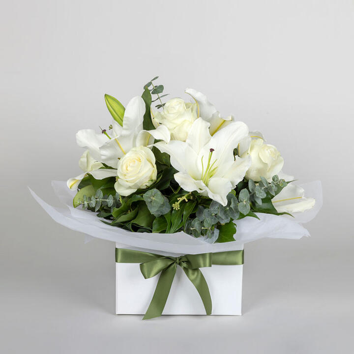 Surprise a loved one with White Florals. Featuring white oriental lilies, white roses and sim carnations, your recipient will be delighted. Displayed in a white box and tied off with olive green satin ribbon, this is the perfect posy to send for a range of occasions. Order online today.
