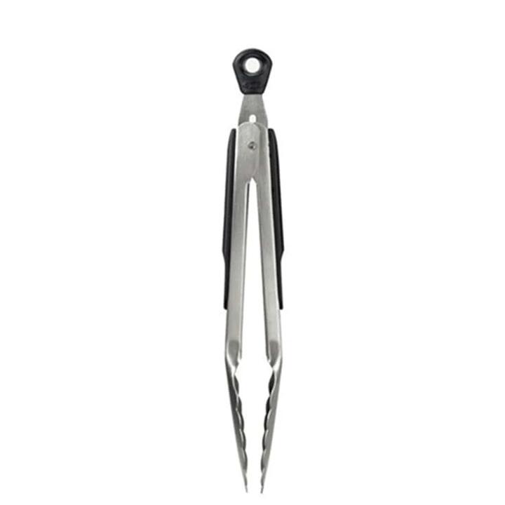 VALID ONLINE ONLY. Equip your kitchen with the OXO 9 Locking Tongs Equip your kitchen with the OXO Locking Tongs 23cm. Made from high quality stainless steel for long lasting use and featuring non-slip handles for safety, the OXO Locking Tongs 23cm are a kitchenware essential like no other. The tongs also feature thumb rests for comfort and have scalloped edges to securely hold onto food for easy cooking, tossing and transferring. With a handy hanging loop and the ability to lock closed for convenient storage, the OXO Locking Tongs 23cm are dishwasher friendly for the ultimate culinary experience. Features • Sturdy stainless steel – Thumb rests – Safe for non-stick cookware – Dishwasher safe – Lock mechanism for easy storage Dimensions H23cm What Am I Buying 1 x OXO 9 Locking Tongs