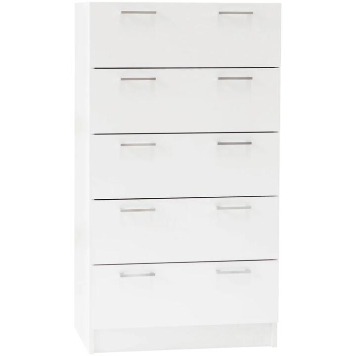 Product Description, Keep your home well organized and neat with this sleek modern hardware. Stylish modern design keeps your home up-to-date. Its five drawers provide plenty of space for your unused décor or other items. Make the area it is place in a bit more homey with some décor or pictures on top of it. The U-shaped silver coloured plastic handle provide a sleek design and a bit more detail to its overall look. Features, Modern Classic design. 5 drawers for plenty of storage space. MB Foil Laminated, All panels 15mm particle board construction. U Shape silver coloured plastic handle. White metal drawer runners, Wall Anchoring Bracket or Strap provided for Anti Toppling Safety, Dimensions, Overall Dimensions:, Width: 60cm, Depth: 42cm, Depth: 44cm (inc handles), Height: 108.2cm, Internal Drawer Dimensions:, Width: 51.9cm, Depth: 32.8cm, Height: 11.4cm, Drawer Front height: 19.6cm, Colour: White Package Contents:, 1 x 5 Drawer Chest (with parts included for assembly), 1 x Users Guide & Warranty Certificate, Please Note: During the assembly process it is normal to see a small amount of chipping internally. This in no way affects the integrity of the fully assembled product. This furniture needs to be anchored to the wall with the enclosed safety fitting to prevent it from tipping over. Different wall materials require different types of fixing devices. Use fixing devices suitable for the walls in your home, not included. Note:- Actual product colours may vary due to lighting, studio photography, room conditions, different screens on various devices. – All our furniture product are flat pack (assembly required) for safe handling purposes.