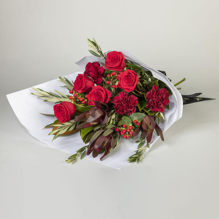 Order Love at First Sight for Valentine’s Day! These Valentine’s Day flowers will be sure to brighten your partner's day. This rose and carnation bouquet also features natives and is presented in a white wrap with black ribbon.