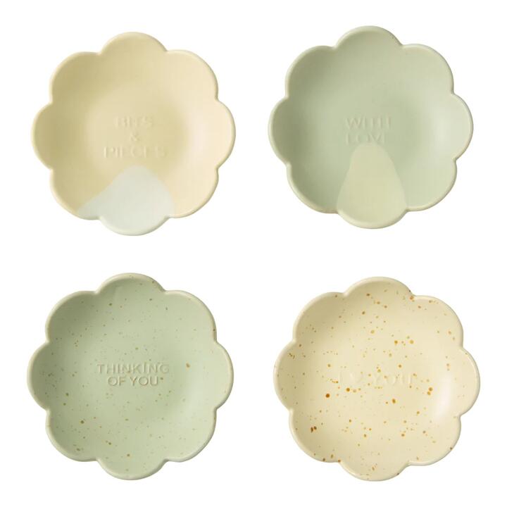 Price is for single item. Multiple items shown as a surprise design option. Each sold separately. Subject to availability. Colours and styles WILL vary, and your choice of design may not be shipped as orders will be picked at random. The charming Made Of This Trinket Dishes feature scalloped edges and gentle pastel glazes in sage and cream tones with delicate speckled finishes. Each bears a sweet message: "Bits & Pieces," "With Love," "Thinking of You," and "I Love You." Perfect for holding jewellery, keys, or small treasures, they add a touch of whimsy to any space whilst keeping precious items organised. Shop Made Of This for more self-care and gift ideas. Features • Soft, earthy pastels and speckle details adorn our scallop-edge trinket dishes• Perfect for holding jewellery, keys, or small treasures• Perfect for gifting or for a self-love reminder• Available in 4 designs – designs picked and shipped at random• Shop Made Of This for more self-care and gift ideas What Am I Buying 1 x Trinket Dish Materials Stoneware Dimensions 10cm