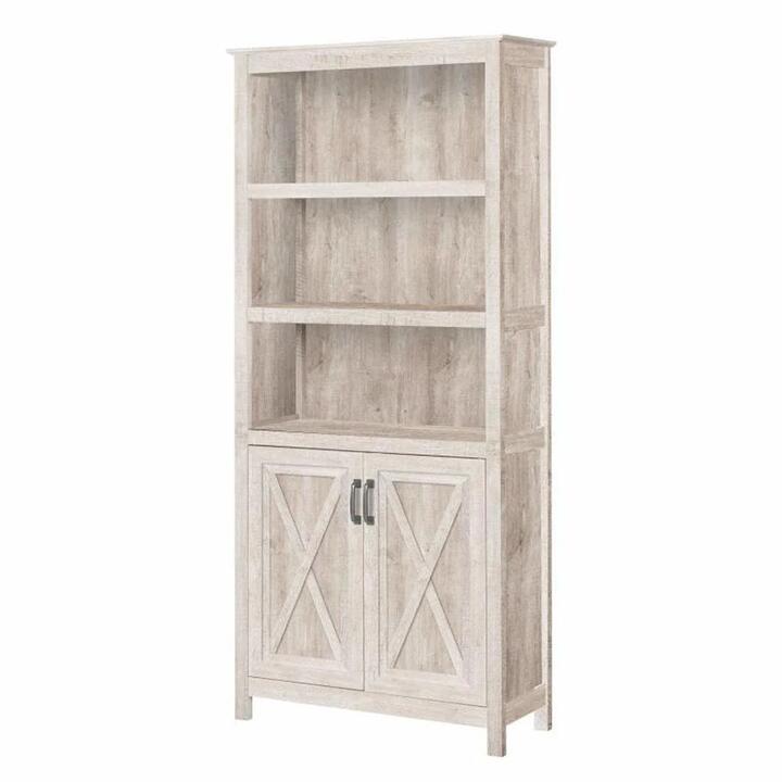 From the stylish collection, this rustic contemporary two-door bookcase is the perfect addition to your office, bedroom, or living area. The versatile bookshelf is equipped with a lower two-door cabinet for concealed storage, while three upper shelves facilitate organization and display of books and personal mementos. The bookcase delivers on a relaxed look and feels with wood grain accents while X-cross details on doors add farmhouse flair. Tall and compact, this shelf adds ample storage with a minimal footprint that conserves space in any room. Features, Constructed from premium MDF with laminated finish, Five shelves for organized storage and display in a bedroom, office, or living area, Metal hardware in a contrasting dark finish adds rustic appeal, Laminate surfaces are durable and easy to wipe clean, Dimensions, W 83.8 x D 31.6 x H 180 cm. Note:- Actual product colours may vary due to lighting, studio photography, room conditions, different screens on various devices. – All our furniture product are flat pack (assembly required) for safe handling purposes.