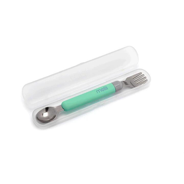 Price is for single item. Multiple items shown. Each sold separately. Subject to availability. Colours and styles may vary from time to time. Orders will be picked at random. The Melii Spork Set is the perfect addition to and lunchbox! Ever notice that since having kids everything seems – well, sticky? Our detachable spoon and fork combo comes in a compact travel case to keep sticky little utensils contained after use (rather than all over your diaper bag). Use the stainless steel spoon and fork together or separately. Designed to feed little mouths and be held by little hands, the Melii Spork Set is the perfect eating utensil for little ones. Features • BPA free, lead free, PVC free, cadmium free • Detachable spoon and fork can be used together or detached and used separately • Compact carrying case • Soft grip spoon is designed for small children • Encourages self-feeding • Durable and lightweight • Age 12+ months Materials • Stainless Steel Dimensions • Travel Case: 2.5 x 19.5 x 3.3cm • Spork: 1.3 x 18.3 x 2.5c