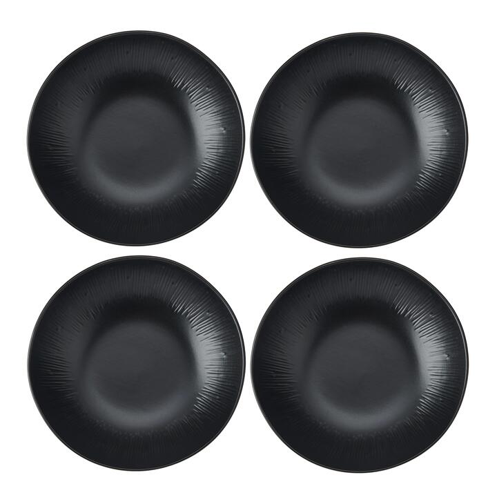 Where botanical elements and statement design combine, the Mikasa Jardin Set of 4 Midnight Pasta Bowls is destined to impress your guests. Part of a collection inspired to bring the outdoors inside, each piece in the stoneware set is finished in a contemporary, matte black glaze with debossed organic detailing. Versatile to the core, this pasta bowl set is perfect for everyday dining, special occasions, and alfresco meals. So, whatever youre serving on it, it's bound to make a bold impression against a white backdrop. Microwave and dishwasher safe for easy use, this set also includes a 10-year guarantee. Each dining piece in Mikasas Jardin Midnight collection is subtly different, adding to the uniqueness of the range. Explore the rest of the edit for matching plates, mugs and more. Features• BOTANICAL VIBES: bring the outdoors in with this set of 20cm pasta bowls• ORGANIC DETAILS: debossed with organic detailing and finished with a black glaze• EVERYDAY DINING: made of strong stoneware, this pasta bowl set can be used for every day as well as special occasionsWhat Am I Buying4 x Pasta BowlsMaterialsCeramicDimensions23cm x 23cm x 17cm