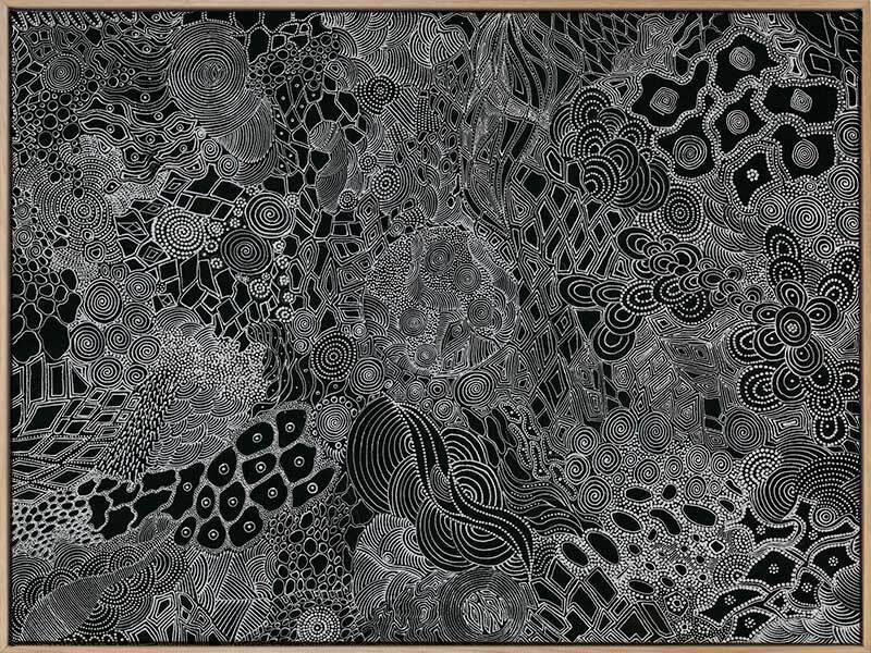 Mina Mina Jukurrpa I Canvas Art Print – This Indigenous Aboriginal artwork features intricate white lines and dots which form concentric circles and shapes against a black background in this incredibly detailed piece inspired by Mina Mina, a sacred site near Lake Mackay and the Western Australian border. Urban Road is committed to investing a stream of ongoing financial support back into the Yuendumu and Nyirripi artist community. For every Mina Mina Jukurrpa I artwork sold, a percentage of the sale price goes directly back to the artist. This Indigenous Aboriginal artwork depicts the story of the women that danced in celebrations of the 'mulju' (Summer rains) at the Mina Mina, a very important women's Dreaming site in the Northern Territory of Australia, while collecting 'karlangu' (digging sticks). Their journey took them to far lands across the Northern Territory – from the west to the east of Yuendumu – creating many places as they went, while dancing, digging and collecting many ceremonial elements, such as 'parraja' carrying vessels made from 'ngalyipi', the snake vine that grows on the desert oak tree known as 'kurrkara'. The Napangardi women embraced the opportunity to be with one another, and when they stopped, they delighted in bush tucker from the area, like the delicious desert truffle 'jintiparnta'. The Dreaming track eventually took them far beyond Warlpiri country, into Queensland. In Warlpiri paintings, traditional iconography is used to represent the Jukurrpa and other elements. In many paintings of this Jukurrpa, sinuous lines are used to represent the 'ngalyipi' (snake vine). Concentric circles are often used to represent the 'jintiparnta' (desert truffles) that the women have collected, while straight lines can be used to depict the 'karlangu' (digging sticks). Be inspired by uniquely breathtaking Indigenous Aboriginal Art and vibrant retellings of the Dreamtime, and bring this stunning artwork into your home today. Disclaimer: Colours of Urban Road products may vary due to device display differences, monitor settings, inherent product variations, lighting conditions, and screen calibration. While we strive for accuracy, slight variations may occur. For any concerns, contact our customer support. Your satisfaction is our priority. STRETCHED CANVAS Urban Road's stretched canvas fine art prints are professionally printed on polycotton artist canvas, using archival inks and then stretched and gallery wrapped. This means the image is stretched around a 38mm frame to create a seamless, museum-quality finish. All stretched and box framed art prints arrive ready to hang. SHADOW BOX FRAMES We also offer the option to add a shadow box frame to your Urban Road canvas art print. A little different from a traditional framed print, the canvas sits within the box frame with a 5mm gap, creating a sophisticated shadow effect between the frame and the canvas. Our solid timber box frame mouldings are 10mm wide, and 55mm deep, and add approximately 40mm to the length and height of the listed canvas size. ROLLED CANVAS ART At Urban Road, we also offer you the option to purchase your canvas art print unframed to allow you to have it framed your own way. As with our stretched and box framed canvas products, our rolled canvas prints are professionally printed on durable, museum-quality, matte coated polycotton canvas and made to order. Our rolled canvas products are printed to the listed stretched size, and come with an additional 45mm mirrored edge plus another 60mm white border to allow for gallery wrapping.