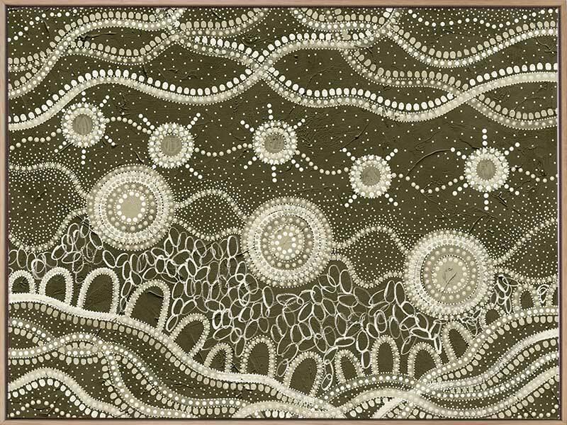 Murriyang Green Canvas Art Print – Murriyang – "Sky World, Where Biyaami, the Great Creator Lives". A truly magical piece featuring a beautiful blend of shapes, lines and dots, resulting in a unique composition that adds a sense of depth to your space. Colour palette includes a khaki green backdrop, bringing forward tones of lighter green and soft white. Do you take time to stop and watch the stars? Murriyang represents evenings spent on Country with the artist's family, taking time to sit and watch the stars that shine overhead. Every star tells a story. As you watch them glisten, you know that each one has so much to share, as the winds blow between heaven and earth, wind whirling around, carried into the night sky and connecting all of us as one. Complimenting any decor and colour theme in your home or office space, this collection boasts intensely cool palettes, from midnight blue and saltwater teal, along with warm palettes of scorched earth red, sunset orange and sandy white. Any of these pieces will be sure to bring a special Dreamtime into your favourite room. Urban Road is committed to investing a stream of ongoing financial support back to our artist community. For every artwork sold, a percentage of the sale price goes directly back to the artist. Disclaimer: Colours of Urban Road products may vary due to device display differences, monitor settings, inherent product variations, lighting conditions, and screen calibration. While we strive for accuracy, slight variations may occur. For any concerns, contact our customer support. Your satisfaction is our priority. STRETCHED CANVAS Urban Road's stretched canvas fine art prints are professionally printed on polycotton artist canvas, using archival inks and then stretched and gallery wrapped. This means the image is stretched around a 38mm frame to create a seamless, museum-quality finish. All stretched and box framed art prints arrive ready to hang. SHADOW BOX FRAMES We also offer the option to add a shadow box frame to your Urban Road canvas art print. A little different from a traditional framed print, the canvas sits within the box frame with a 5mm gap, creating a sophisticated shadow effect between the frame and the canvas. Our solid timber box frame mouldings are 10mm wide, and 55mm deep, and add approximately 40mm to the length and height of the listed canvas size. ROLLED CANVAS ART At Urban Road, we also offer you the option to purchase your canvas art print unframed to allow you to have it framed your own way. As with our stretched and box framed canvas products, our rolled canvas prints are professionally printed on durable, museum-quality, matte coated polycotton canvas and made to order. Our rolled canvas products are printed to the listed stretched size, and come with an additional 45mm mirrored edge plus another 60mm white border to allow for gallery wrapping.