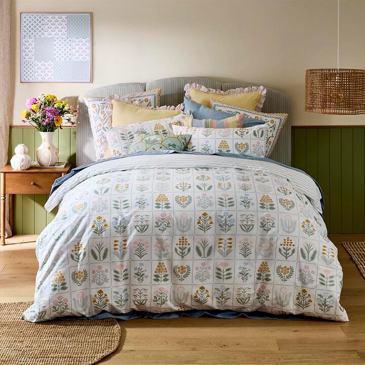 The MyHouse Jodie Quilt Cover Set showcases a quilt-inspired cottage floral design on crisp white, featuring delicate flower illustrations with a simple green stripe reverse. This quilt cover set includes one quilt cover and two pillowcases, available in Queen to Super King sizes. Complete your bedroom styling by pairing with the matching European Pillowcase for coordinated charm and style a fresh, cosy space this spring. Shop MyHouse for more quilt covers and bed linen including bed sheets, pillowcases, throws, and cushions. Features• Sweet floral illustrations inspired by cottage living and quilting• Simple green stripe reverse for two quilt covers in one• Style with matching bed sheets, pillowcases, and complementary throws and cushions• Pair with the matching European Pillowcase• Available in sizes ranging from Queen to Super King• Machine washable for easy care and maintenance• Shop MyHouse for more quilt covers and bed linen including bed sheets, pillowcases, throws, and cushionsWhat Am I Buying• 1 x Quilt Cover• 2 x PillowcaseMaterialsCottonDimensionsRefer to size guide