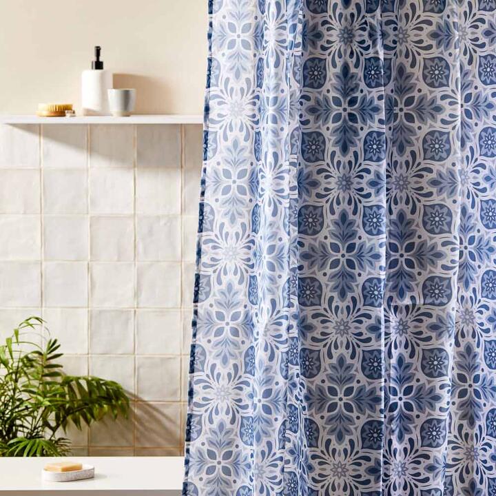 Theres nothing better than a warm, steamy shower after a long day. That is until theres water everywhere and you have to deal with a soggy bathroom. Youll soon be able to enjoy a shower while keeping your bathroom dry with the MyHouse Moroccan Shower Curtain. This shower curtain, made from polyester, is coloured with a gorgeous blue hues, creating a Moroccan hotel atmosphere right from your own home. The material is water resistant, ensuring your bathroom floor will stay dry and no dampness will hang in your shower curtain. Designed to pair with shower/bath combinations, this curtain works best with the MyHouse Shower Curtain Rings for easy installation in your bathroom. Features • Includes 1 x shower curtain • Keeps your showers steamy and your bathroom dry • Easy to care for • Polyester material with blue hues that feel like you're in a Moroccan hotel • Easily installed with shower curtain rings – sold separately Dimensions • 180 x 200cm Materials • Polyester