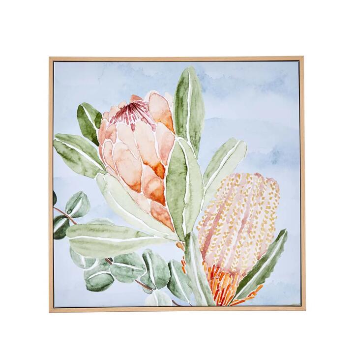 Bring the enchanting beauty of Australian flora into your home with the MyHouse Protea Wall Art. This canvas print features glorious Protea blooms, capturing the unique charm of Australia's natural heritage. With this scene being lovingly hand-painted in house, each brushstroke has been thoughtfully applied to create a harmonious blend of soft pinks, gentle greens, and sky blues that dance across the canvas. Perfect for nature enthusiasts and art lovers alike, this stunning artwork adds a sophisticated focal point to any room. The serene composition creates a peaceful atmosphere whilst bringing a touch of the Australian bush indoors. Match with pieces from the MyHouse Darwin range for coordinated accents in any room. Shop MyHouse for more home décor, bathroom pieces, bed linen, and bedding perfect for this season. Features• Design hand-painted in house• Soft pinks, sky blue, and earthy greens come together to illustrate Australias natural beauty• Perfect for bedrooms, guest rooms, living spaces, or home offices • Mix and match with pieces from the MyHouse Darwin range for a fun, native botanical accent in your space• Our Wall Art pieces are also available in Native Bird, Gumnut, Hydrangea, Magnolia, Palm, Leaf, and Flower styles• Shop MyHouse for more home décor, bathroom pieces, bed linen, and bedding perfect for this seasonMaterialsCanvas, WoodDimensions50cm x 50cm