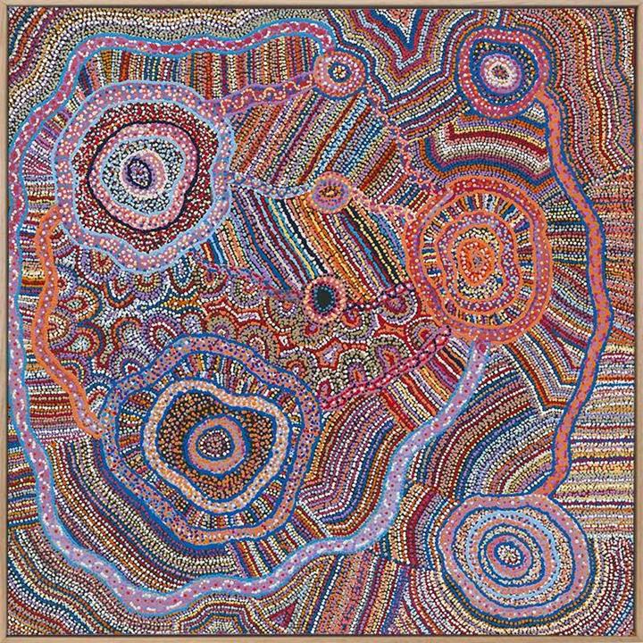 Ngapa Jukurrpa II Canvas Art Print – A colourful and visually striking Indigenous Aboriginal artwork piece that sees songlines of meticulously placed dots and lines radiating from central circles, representing soakages. The colour palette is a kaleidoscope of purples, blues, reds and oranges. Urban Road is committed to investing a stream of ongoing financial support back into the Yuendumu and Nyirripi artist community. For every Ngapa Jukurrpa II artwork sold, a percentage of the sale price goes directly back to the artist. This Indigenous Aboriginal artwork depicts the water Dreaming, and tells a story of two Jangala men, rainmakers, who sang for the rain and unleashed a giant storm. The storm travelled from the east to the west until it reached Warlura, a waterhole to the east of Yuendumu in the Northern Territory. At Warlura, a gecko blew the storm away. The storm continued on, covering the lands with rain and shooting out bolts of lightning, awakening the 'kurdukurdu mangkurdu Jukurrpa' (children of the clouds Dreaming). The water Dreaming built hills at Ngamangama, and stuck long pointy clouds into the ground at Jukajuka, where they can still be seen today in the Northern Territory as rock formations. The water Dreaming continued its travels to Mikanji, a watercourse northwest of Yuendumu, where the storm was picked up by a 'kirrkarlanji' (brown falcon) and taken farther north. At Puyurru, the falcon dug up a giant 'warnayarra' (rainbow serpent). The serpent carried water with it to create another large lake, before travelling on through other locations and eventually arriving at Gurindji country to the north. In contemporary Warlpiri paintings, traditional iconography is used to represent the 'Jukurrpa' (Dreaming). Short dashes are often used to represent 'mangkurdu' (cumulus & stratocumulus clouds), and longer, flowing lines represent 'ngawarra' (flood waters). Small circles are used to depict 'mulju' (soakages) and riverbeds. Be inspired by uniquely breathtaking Indigenous Aboriginal Art and vibrant retellings of the Dreamtime, and bring this stunning artwork into your home today. Disclaimer: Colours of Urban Road products may vary due to device display differences, monitor settings, inherent product variations, lighting conditions, and screen calibration. While we strive for accuracy, slight variations may occur. For any concerns, contact our customer support. Your satisfaction is our priority. STRETCHED CANVAS Urban Road's stretched canvas fine art prints are professionally printed on polycotton artist canvas, using archival inks and then stretched and gallery wrapped. This means the image is stretched around a 38mm frame to create a seamless, museum-quality finish. All stretched and box framed art prints arrive ready to hang. SHADOW BOX FRAMES We also offer the option to add a shadow box frame to your Urban Road canvas art print. A little different from a traditional framed print, the canvas sits within the box frame with a 5mm gap, creating a sophisticated shadow effect between the frame and the canvas. Our solid timber box frame mouldings are 10mm wide, and 55mm deep, and add approximately 40mm to the length and height of the listed canvas size. ROLLED CANVAS ART At Urban Road, we also offer you the option to purchase your canvas art print unframed to allow you to have it framed your own way. As with our stretched and box framed canvas products, our rolled canvas prints are professionally printed on durable, museum-quality, matte coated polycotton canvas and made to order. Our rolled canvas products are printed to the listed stretched size, and come with an additional 45mm mirrored edge plus another 60mm white border to allow for gallery wrapping.