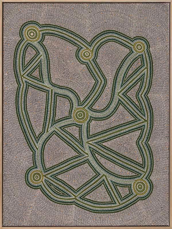 Ngapa Jukurrpa III Green Canvas Art Print – Inspired by the Water Dreaming, this incredibly intricate Indigenous Aboriginal artwork features thousands of meticulously placed dots, culminating in a maze-like shape in a colour palette of warm brown, and khaki green. Urban Road is committed to investing a stream of ongoing financial support back into the Yuendumu and Nyirripi artist community. For every Ngapa Jukurrpa III artwork sold, a percentage of the sale price goes directly back to the artist. This Indigenous Aboriginal artwork depicts the water Dreaming, and tells a story of two Jangala men, rainmakers, who sang for the rain and unleashed a giant storm. The storm travelled from the east to the west until it reached Warlura, a waterhole to the east of Yuendumu in the Northern Territory. At Warlura, a gecko blew the storm away. The storm continued on, covering the lands with rain and shooting out bolts of lightning, awakening the 'kurdukurdu mangkurdu Jukurrpa' (children of the clouds Dreaming). The water Dreaming built hills at Ngamangama, and stuck long pointy clouds into the ground at Jukajuka, where they can still be seen today in the Northern Territory as rock formations. The water Dreaming continued its travels to Mikanji, a watercourse northwest of Yuendumu, where the storm was picked up by a 'kirrkarlanji' (brown falcon) and taken farther north. At Puyurru, the falcon dug up a giant 'warnayarra' (rainbow serpent). The serpent carried water with it to create another large lake, before travelling on through other locations and eventually arriving at Gurindji country to the north. In contemporary Warlpiri paintings, traditional iconography is used to represent the 'Jukurrpa' (Dreaming). Short dashes are often used to represent 'mangkurdu' (cumulus & stratocumulus clouds), and longer, flowing lines represent 'ngawarra' (flood waters). Small circles are used to depict 'mulju' (soakages) and riverbeds. Be inspired by uniquely breathtaking Indigenous Aboriginal Art and vibrant retellings of the Dreamtime, and bring this stunning artwork into your home today. Disclaimer: Colours of Urban Road products may vary due to device display differences, monitor settings, inherent product variations, lighting conditions, and screen calibration. While we strive for accuracy, slight variations may occur. For any concerns, contact our customer support. Your satisfaction is our priority. STRETCHED CANVAS Urban Road's stretched canvas fine art prints are professionally printed on polycotton artist canvas, using archival inks and then stretched and gallery wrapped. This means the image is stretched around a 38mm frame to create a seamless, museum-quality finish. All stretched and box framed art prints arrive ready to hang. SHADOW BOX FRAMES We also offer the option to add a shadow box frame to your Urban Road canvas art print. A little different from a traditional framed print, the canvas sits within the box frame with a 5mm gap, creating a sophisticated shadow effect between the frame and the canvas. Our solid timber box frame mouldings are 10mm wide, and 55mm deep, and add approximately 40mm to the length and height of the listed canvas size. ROLLED CANVAS ART At Urban Road, we also offer you the option to purchase your canvas art print unframed to allow you to have it framed your own way. As with our stretched and box framed canvas products, our rolled canvas prints are professionally printed on durable, museum-quality, matte coated polycotton canvas and made to order. Our rolled canvas products are printed to the listed stretched size, and come with an additional 45mm mirrored edge plus another 60mm white border to allow for gallery wrapping.