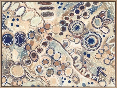 Ngu-Nha Neutral Blue Canvas Art Print – Bursting with life, this Aboriginal artwork by Wiradjuri artist, Amanda Hinkelmann, enriches any space with its vibrant design and intricate circular shapes and flowing lines. Using traditional Indigenous dot painting techniques and a soft palette of muted blue and beige tones, this piece creates a comforting and inviting atmosphere. Indigenous Aboriginal peoples have a unique, Elder-given knowledge of country, allowing us to sense changes in weather, surroundings, vegetation, and animal movements. This deep connection to country is felt rather than explained. This artwork abstractly represents country, symbolising our knowledge and ability to read, live from, and care for the land – a language unknown to others. Urban Road is committed to investing a stream of ongoing financial support back to our artist community. For every artwork sold, a percentage of the sale price goes directly back to the artist. This versatile collection of Indigenous art by renowned Wiradjuri artist, Amanda Hinkelmann, features an expressive neutral palette in multiple colourways, including muted brown, blue, green, and pink tones. Perfect for celebrating NAIDOC Week 2024, these Aboriginal art pieces bring warmth, comfort, and a touch of elegance to your space. Support First Nations art and let your walls tell stories rich in culture and heritage.