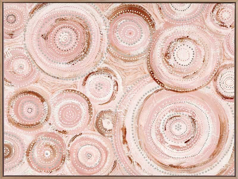 Nirrangi Canvas Art Print – Soft, delicate and ethereal, this contemporary Indigenous Aboriginal artwork has been created by Wiradjuri artist Amanda Hinkelmann. The piece uses a series of overlapping, intertwining concentric circles to convey the complexities of human life on this earth, and the importance of feeling small. The colour palette is gentle and feminine, with soft pinks, nudes and beiges accented by rich copper flecks. We often try to be big, powerful, seen. But true human connection, true vulnerability and the recognition of our life within this world, can often be noticed the most when we are, in fact, small. This is represented in the concentric circles in this piece. The smallest of stones dropped within the ocean or the mighty river can often have the biggest impact. Because sometimes it's important to feel, well, small. Urban Road is committed to investing a stream of ongoing financial support back to our artist community. For every artwork sold, a percentage of the sale price goes directly back to the artist. Disclaimer: Colours of Urban Road products may vary due to device display differences, monitor settings, inherent product variations, lighting conditions, and screen calibration. While we strive for accuracy, slight variations may occur. For any concerns, contact our customer support. Your satisfaction is our priority. STRETCHED CANVAS Urban Road's stretched canvas fine art prints are professionally printed on polycotton artist canvas, using archival inks and then stretched and gallery wrapped. This means the image is stretched around a 38mm frame to create a seamless, museum-quality finish. All stretched and box framed art prints arrive ready to hang. SHADOW BOX FRAMES We also offer the option to add a shadow box frame to your Urban Road canvas art print. A little different from a traditional framed print, the canvas sits within the box frame with a 5mm gap, creating a sophisticated shadow effect between the frame and the canvas. Our solid timber box frame mouldings are 10mm wide, and 55mm deep, and add approximately 40mm to the length and height of the listed canvas size. ROLLED CANVAS ART At Urban Road, we also offer you the option to purchase your canvas art print unframed to allow you to have it framed your own way. As with our stretched and box framed canvas products, our rolled canvas prints are professionally printed on durable, museum-quality, matte coated polycotton canvas and made to order. Our rolled canvas products are printed to the listed stretched size, and come with an additional 45mm mirrored edge plus another 60mm white border to allow for gallery wrapping.