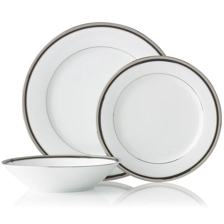 A canopy of platinum leaves adorns the Noritake Toorak Noir 12 Piece Dinner Set. The Toorak Noir is an elegant contemporary formal design, featuring a crisp thin band of black on fine white porcelain body. Accentuated by a richly embossed leaf motif trim of sparkling platinum, it is bursting with life yet subtle and restrained in style. You will find it versatile enough to use as a breakfast setting on the most formal of dining occasions. Designed in Japan, Toorak Noir is Chip Resistant and Dishwasher Safe. Noritake has been a bastion of ceramic artistry and craftsmanship around the world since 1902, after growing out of the Morimura Brothers trading company in New York City. Each piece is imbued with the same spirit and thoughtfulness of the first Noritake factory, established near Nagoya on the Japanese mainland. Features • Designed in Japan • Accentuated by a richly embossed leaf motif of sparkling platinum • Fine white porcelain body, encircled by a crisp, thin band of black• Well suited for formal or everyday use • Chip resistant and dishwasher safe • Delicately giftboxed What Am I Buying 4 x 21cm Entrée Plates4 x 27cm Dinner Plates4 x 19cm Coupe Soup Bowls Dimensions Entrée Plates: 21cm, Dinner Plates: 27cm, Coupe Soup Bowls: 19cm