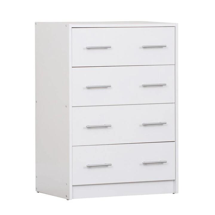 Ideal for storing clothes, toys or miscellaneous bric-a-brac from around the home, this white chest of drawers features 4 drawers with plenty of storage space. Complete with silver coloured accents, this stylish furniture piece is made from paper laminated particle board and has a white finish. This furniture needs to be anchored to the wall with the enclosed safety fitting to prevent it from tipping over. Different wall materials require different types of fixing devices. Use fixing devices suitable for the walls in your home, not included. Features:, Perfect for storing anything and everything, 4 drawers for plenty of storage space, Paper foil lamination matt finish, Drawer Fronts 15mm Particle Board, Single Laminated 3mm MDF Backing Board and drawer base, All other panels 15mm Particle Board, Metal Drawer Runners, Black coloured accents, Wall Anchoring Bracket or Strap provided for Anti Toppling Safety, Overall Dimensions:, Width: 64cm, Depth: 39.5cm, Height: 88.5cm, Individual Drawer Internal Dimensions:, Width: 54.8cm, Depth: 31cm, Height: 13.3cm, Colour: White Package Contents:, 1 x Chest of 4 Drawers (with parts included for assembly), 1 x Users Guide & Warranty Certificate, Please Note: During the assembly process it is normal to see a small amount of chipping internally. Note:- Actual product colours may vary due to lighting, studio photography, room conditions, different screens on various devices. – All our furniture product are flat pack (assembly required) for safe handling purposes.