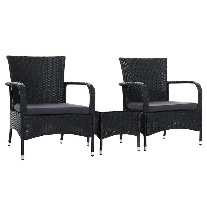 Enjoy the pleasant outdoors or have a nice chat with friends over a cuppa with our Gardeon 3-pc Outdoor Set. With its chic and trendy profile, the set comes with two chairs and a matching table. Finished in meticulously weaved UV-resistant and weather-resistant PE wicker with a strong and sturdy powder-coated steel frame construction for both chairs and table, this outdoor set is designed to please as well as stand up to the weather elements. The chairs have an elegant contoured design with spacious seating and 5cm thick high-density foam cushions to ensure comfort and style are always in place. If you spill your drink, the 5mm thick tempered glass tabletop and removable seat cushion covers make cleaning up hassle-free. With so much going for it, the outdoor set certainly deserves its coveted space in your lovely backyard, deck or patio. Or even indoors for a unique presence. Features:, Comfortable and chic set, Wide backrest, Spacious seating, UV-resistant and weather-resistant, Hand-woven PE wicker, Tempered glass top side table, Sturdy powder-coated steel frame, Premium high-density foam cushions, Weatherproof, removable and washable seat covers, Specifications:, Brand: Gardeon, Material: PE wicker, Frame: Steel, Finish: Powder-coated, Glass top thickness: 5mm, Cushion thickness: 5cm, Chair dimensions: 63cm x 63cm x 83.5cm, Side table dimensions: 40cm x 40cm x 38cm, Cushion cover colour: Grey, Colour: Black, Package Contents:, 2 x Chairs, 1 x Coffee table, 2 x Cushion, 1 x Manual. Note:- Actual product colours may vary due to lighting, studio photography, room conditions, different screens on various devices. – All our furniture product are flat pack (assembly required) for safe handling purposes.