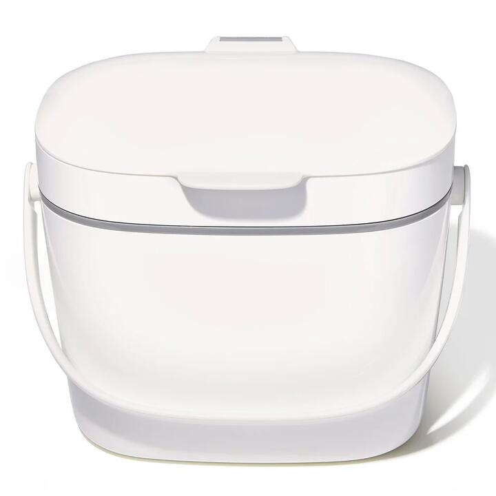 Uncomplicate composting with the OXO Easy Clean Compost Bin. Designed to sit on countertops, the bin is designed to keep composting bags tucked inside for a neat look. The 6.62 litre capacity makes it perfect for culinary creatives, but the easy-to-use, stay-open lid makes it easy for anyone to use. The lid helps keep odours from escaping and the smooth interior makes it a breeze to clean, even if you dont use composting bags. The convenient handle makes transporting the bin easy, and the handle folds down out of the way when not in use..Features• Unique design keeps bags tucked inside for a neat look• 6.62 litre capacity perfect for busy kitchens• Smooth interior makes Bin easy to clean • Odor-containing and pest-reducing since oxygen can flow through the soft-close lidMaterialsPlasticDimensions21.2cm x 25.7cm x 30.5cm
