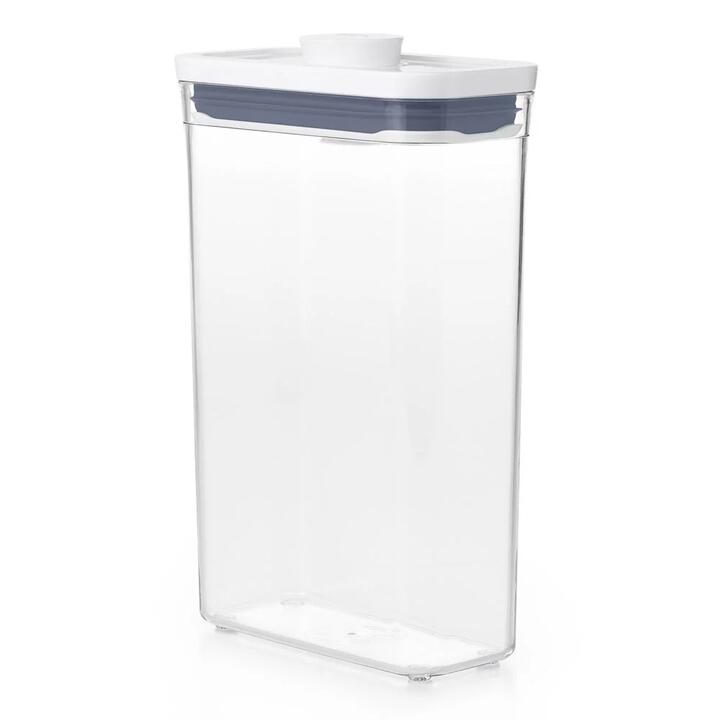 Keep your pantry organised with the OXO POP 2.0 Slim Rectangular Container Medium. Airtight, stackable, space-efficient, and dishwasher safe, OXO POP Containers keep dry foods fresh and kitchens organized. New shapes and sizes provide new possibilities for storing everyday must-haves like flour, sugar, coffee, cereal, oatmeal, coffee, grains, pasta, and spices. With a handy fill line to guide you, curved corners for smooth dispensing and sturdy, BPA-free construction, these canisters take tidying to the next level. POP Containers arent just for kitchens: use them any place you want more organization. Perfect for benchtop pantry storage, the OXO POP 2.0 Slim Rectangular Container Medium is a versatile container. Features• Airtight, space-efficient design keeps dry foods fresh and your cupboards organized • Convenient fill line makes it easy to store staples like cereal, flour, sugar, pasta, rice, coffee, nuts and snacks • Push the button to engage the airtight seal. The button doubles as a handle for the lid. For best results, always use the button to open and close • BPA-freeMaterials• PlasticDimensions• 1.8L