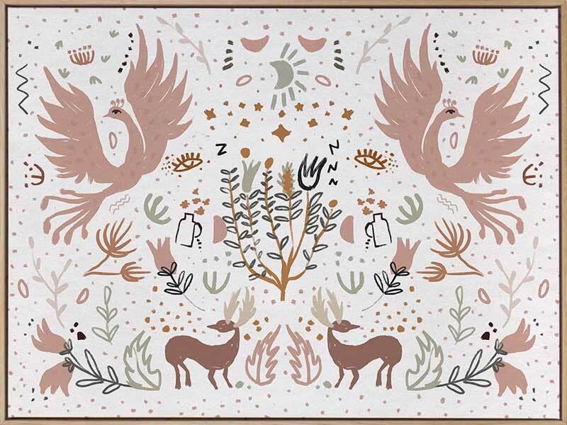 Phoenix Rising Canvas Art Print – This soft, whimsical illustrated motif features an eclectic array of hand drawn elements, including phoenixes, deer and botanicals. The colour palette is light and bright, with blush, brown and sage against a textured white background. Disclaimer: Colours of Urban Road products may vary due to device display differences, monitor settings, inherent product variations, lighting conditions, and screen calibration. While we strive for accuracy, slight variations may occur. For any concerns, contact our customer support. Your satisfaction is our priority. STRETCHED CANVAS Urban Road's stretched canvas fine art prints are professionally printed on polycotton artist canvas, using archival inks and then stretched and gallery wrapped. This means the image is stretched around a 38mm frame to create a seamless, museum-quality finish. All stretched and box framed art prints arrive ready to hang. SHADOW BOX FRAMES We also offer the option to add a shadow box frame to your Urban Road canvas art print. A little different from a traditional framed print, the canvas sits within the box frame with a 5mm gap, creating a sophisticated shadow effect between the frame and the canvas. Our solid timber box frame mouldings are 10mm wide, and 55mm deep, and add approximately 40mm to the length and height of the listed canvas size. ROLLED CANVAS ART At Urban Road, we also offer you the option to purchase your canvas art print unframed to allow you to have it framed your own way. As with our stretched and box framed canvas products, our rolled canvas prints are professionally printed on durable, museum-quality, matte coated polycotton canvas and made to order. Our rolled canvas products are printed to the listed stretched size, and come with an additional 45mm mirrored edge plus another 60mm white border to allow for gallery wrapping.