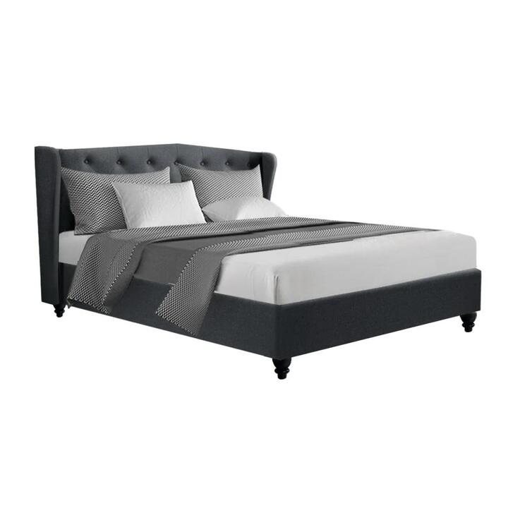 Inspired by French provincial styling, our Pier Bed Frame is the epitome of luxurious elegance with classic nuances. The iconic European wing headboard reflects prestigious grandeur while the tufted design complements its overall image. Padded with high density foam and upholstered in breathable non-woven linen fabric, the Pier Bed Frame is comfortable to lean on and soft to the touch. Not least, the structure is constructed with a sturdy steel frame utilising reinforced steel bars and heavy-duty connectors, and matched with a wooden arch slat base for even weight distribution. An adjustable centre support strut further helps to stabilize the entire ensemble. With its neutral tones, the Pier Bed Frame will blend seamlessly into any décor. So add some premium and timeless chic into bedroom. Order your Pier Bed Frame today. Note: Mattress is sold separately, Features Premium linen fabric Sturdy steel frame Reinforced construction with steel bars Heavy-duty metal connectors Wooden arched slat base Adjustable centre support strut Tufted headboard Padded with high density foam Breathable non-woven fabric, Specifications: Frame: Steel Headboard: Non-woven fabric Fits standard Queen sized mattress: 203 x 153cm Overall dimension: 214.5 x 166 x 104.5cm Colour: Charcoal, Package Content (1) Pier Bed Frame x1 (2) Assembly Manual x1, This product comes with 1 year warranty. Note:- Actual product colours may vary due to lighting, studio photography, room conditions, different screens on various devices. – All our furniture product are flat pack (assembly required) for safe handling purposes.