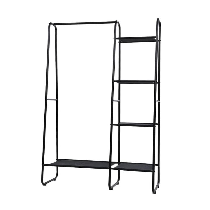 Need more clothing storage? Want a fast and easy option? Then look no further than our Metal Clothes Rack. The frame is made of sturdy powder-coated metal that can safely hold up your clothing and withstand robust use. The clothes rack has an anti-slip hanging bar and U-shaped base for extra stability so that your clothes do not end up on the floor. There are also five plastic storage shelves perfect for storing shoes, hats, folded clothes or other fashion items. The neutral black tone means the clothes rack will fit in with any d��cor and will look stylish even when left out in the open. WARNING Children have died from furniture tipover. ALWAYS secure this furniture with an anchor device. NEVER allow children to stand, climb or hang on drawers, doors, or shelves. Features Contemporary and stylish Sturdy powder-coated metal construction Anti-corrosive Rust-resistant Anti-slip design Ample hanging space Space-saving Easy assembly Specifications: Frame material: Powder-coated metal Shelf: Textilene fabric Maximum load per shelf: 5-10kg Maximum load of hanging bar: 15kg Total capacity: 45kg Overall Dimensions: 101cm x 39.5cm x 151cm Colour: Black Package Content Metal Clothes Rack x 1 Assembly Sheet x 1 This product comes with 1 year warranty. Note:- Actual product colours may vary due to lighting, studio photography, room conditions, different screens on various devices. – All our furniture product are flat pack (assembly required) for safe handling purposes.
