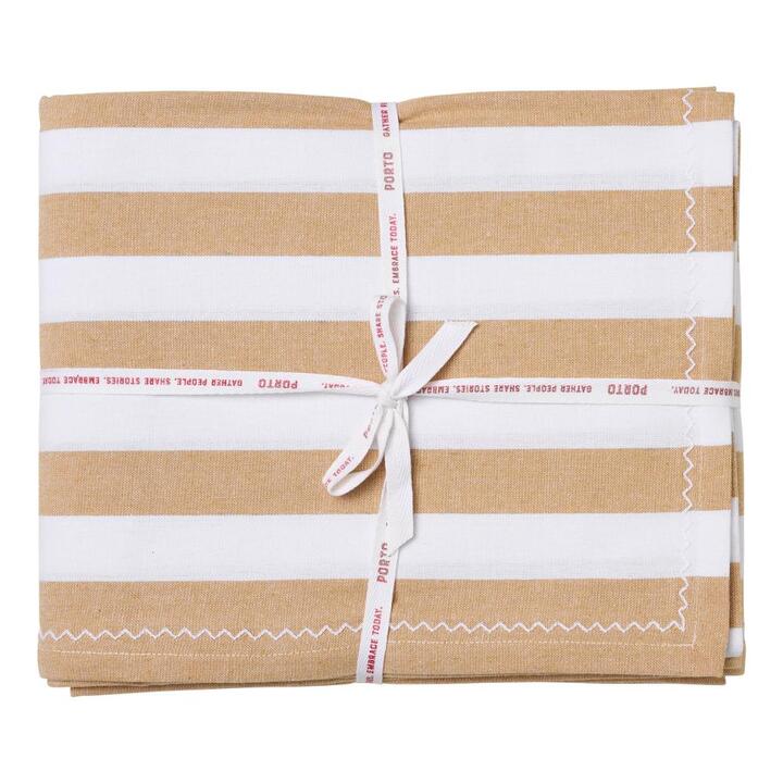 The sea of unmissable stripes and bold colour-blocking across Portos Lola Tablecloth in Almond fills the air with an inviting warmth. Set the table, and the tone, with our earthy almond tablecloth and napkins. Features • Suits table that seats 6-8 What Am I Buying 1 x Tablecloth Materials Cotton, Polyester Dimensions 230 x 150cm