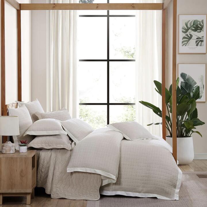 The Private Collection Kingston Quilt Cover Set's sophisticated check pattern, accentuated by a crisp white tailored flange, brings timeless elegance to the bedroom. Select from the calming natural stone or serene moss shades to complement your decor. The set's masculine aesthetic appeals universally, effortlessly integrating into various interiors. This textured ensemble, crafted from premium cotton, promises a luxurious and comfortable night's sleep. Complete with a quilt cover and two coordinating pillowcases, the Private Collection Kingston Quilt Cover Set transforms your space into a haven of style and relaxation. Features Refined check pattern with contrasting white flange Choose from beautiful natural stone or moss shades Masculine look suits a diverse range of interiors This textured set enhances any bedroom aesthetic Crafted from high-quality cotton for a luxurious sleep Includes quilt cover and two coordinating pillowcases Material 100% Cotton Dimensions Refer to Size Guide What Am I Buying 1 x Quilt Cover 2 x Pillowcases