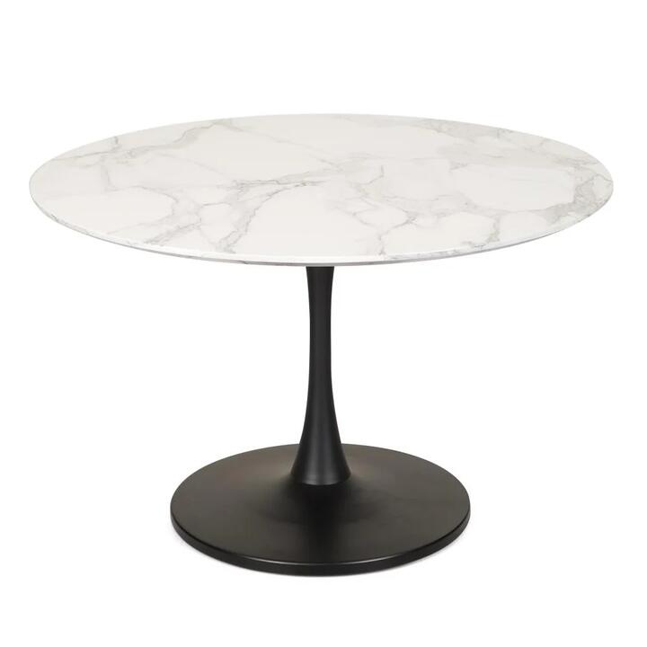 The gorgeous Tulip design of the Cecil Dining table will surely wow you. Its beautiful table top and its marble effect can easily match your other furniture. Features, The round design allows to sit up to 6 people. Table top is made of lacquered MDF with Marble Effect, Sand matte black powder coated pedestal base provides perfect balance and support. Easy to clean surface because of the glossy marble finish. Matte base provides a great contrast to the white table top. Beautiful and durable in it's White Sevella marble finish. Dimensions, W 120 x D 120 x H 76 cm, Dispatch Timing, Normally dispatched within 3 business days, Notes, This item is applicable for 7-Days change of mind only. Note:- Actual product colours may vary due to lighting, studio photography, room conditions, different screens on various devices. – All our furniture product are flat pack (assembly required) for safe handling purposes. – This item is designed for indoor purposes only, it is not UV or Weather Resistant.