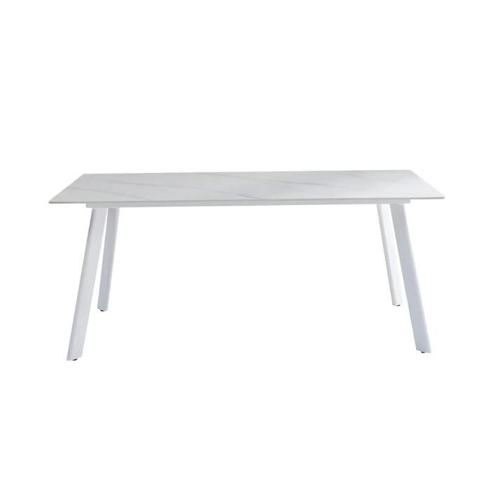 Description, Elevate your dining area with this marble effect dining table, designed for both elegance and everyday durability. The matte snow-white ceramic top features a refined marble pattern that adds timeless charm while resisting scratches for long-lasting use. Supported by a sleek white powder-coated metal frame, the table showcases a clean, minimalist style suited for modern interiors. At 180 cm wide, it comfortably accommodates family gatherings and dinner parties. A versatile piece, it blends style and function to enhance both casual meals and formal occasions. Features, Dining table with a matte snow-white ceramic top featuring a subtle marble effect for refined elegance, Scratch-resistant surface ensures everyday durability and lasting beauty, Sturdy white powder-coated metal frame provides strength with a minimalist look, Generous 180 cm size accommodates family meals, entertaining, or special gatherings, Easy to maintain—simply wipe clean with a dry cloth; avoid abrasive materials, Delivered in 1 secure box for safe handling and setup convenience, Dimensions, W 180 x D 90 x H 76 cm, Dispatch Timing, Normally dispatched within 3 business days, Notes. Note:- Actual product colours may vary due to lighting, studio photography, room conditions, different screens on various devices. – All our furniture product are flat pack (assembly required) for safe handling purposes.