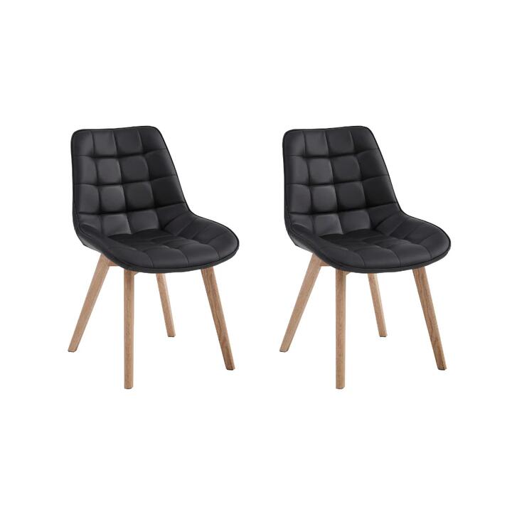 Description, This set of 2 dining chairs blends sleek style with lasting comfort. Upholstered in black eco-leather, they bring a modern, refined touch to any dining room. The solid oak wood legs in a natural finish add strength while balancing the bold seat design. With their versatile silhouette, these chairs complement both contemporary and timeless interiors. A durable and stylish choice for everyday dining and entertaining. Features, Set of 2 dining chairs, delivered in 1 box for easy transport, Upholstered in sleek black eco-leather for a modern, sophisticated look, Solid oak wood legs in a natural finish provide durability and a warm contrast, Timeless silhouette designed to fit seamlessly into both classic and contemporary interiors, Easy to maintain—wipe with a clean, dry cloth; avoid harsh abrasives to protect upholstery and wood finish, Dimensions, Overall: W 52 x D 60 x H 87.5 cm, Seat Height 47 cm, Dispatch Timing, Normally dispatched within 3 business days, Notes. Note:- Actual product colours may vary due to lighting, studio photography, room conditions, different screens on various devices. – All our furniture product are flat pack (assembly required) for safe handling purposes.
