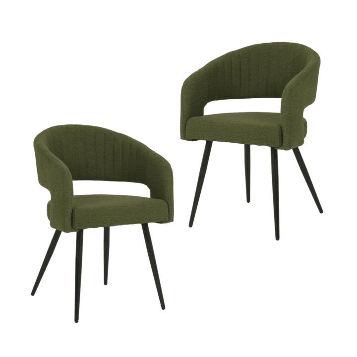 Display a unique styling in your dining area, partnered with your dining table with this chic dining chair. Upholstered in a soft, sumptuous boule fabric, the dining chair features a curved back and wide seat for the utmost dining comfort. The cut-out back design and splayed legs give this chair a glamorous mid-century look. Features, Upholstered with boucle fabric which is known for its elegantly smooth texture and appealing softness, Features arched back rest that hugs you from behind for spinal support and supportive relief for your satisfaction, Generously padded to provide comfort so you can enjoy hours of conversation on the dinner table, Designed with a cut-out backrest for an added style in your dining chair, Angled tubular powder-coated metal legs for a timeless style, Dimensions, W 55 x D 55 x H 83 cm, Dispatch Timing, Normally dispatched within 3 business days, Notes, This item is applicable for 7-Days change of mind only. Note:- Actual product colours may vary due to lighting, studio photography, room conditions, different screens on various devices. – All our furniture product are flat pack (assembly required) for safe handling purposes.