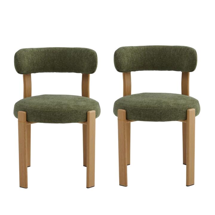 Description Enhance your dining or living space with this set of 2 chenille fabric dining chairs in a sophisticated olive-green tone. The soft textured upholstery creates a cozy yet refined look, while the ash wood-effect coated metal frame combines the natural appeal of wood with the strength and durability of metal. Designed with comfort in mind, the ergonomic seat and supportive backrest make these chairs perfect for everyday dining, entertaining guests, or adding stylish extra seating to your home. Their versatile color and compact design allow them to blend effortlessly with modern, Scandinavian, or minimalist interiors. Built for both function and elegance, these chairs bring long-lasting style to any room, Features, Set of 2 dining chairs packaged together – ideal for dining rooms, kitchens, or versatile seating solutions, Upholstered in rich olive chenille fabric , offering a cozy, elegant, and contemporary aesthetic, Ash wood-effect coated metal frame combines the warm appearance of natural wood with durable metal construction, Ergonomic design with supportive seat and backrest for enhanced comfort during meals or gatherings, Neutral, nature-inspired color palette complements a wide range of interiors—from modern to Scandinavian-inspired spaces, Compact yet stylish build , perfect for apartments, dining nooks, or smaller spaces without sacrificing design appeal, Easy maintenance – simply wipe with a clean, dry cloth; avoid harsh abrasives to maintain fabric and finish, Sturdy and stable construction ensures reliable seating and long-lasting use, Dimensions, Overall: W 51 x D 54 x H 73 cm, Seat Height: 48.5cm, Dispatch Timing, Normally dispatched within 3 business days, Notes. Note:- Actual product colours may vary due to lighting, studio photography, room conditions, different screens on various devices. – All our furniture product are flat pack (assembly required) for safe handling purposes.