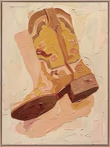 Ranch Boots Canvas Art Print – The artwork features a single, well-worn cowboy boot, its design evoking the rustic charm of the American Wild West. Textured paint create a warm and impressionistic look, with a palette that swirls together tawny browns, creams, and hints of gold. Discover the Wild & Fearless art collection, evoking the wildest dreams of cowboys and desert sunsets, blending the latest trends in interior design into a vibrant tapestry of colour and culture.