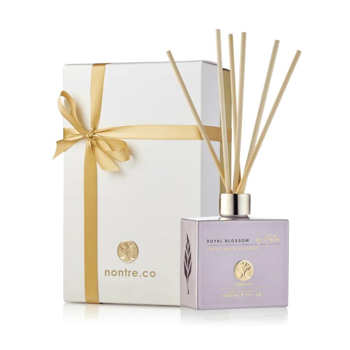nontre's Reed Diffuser, Royal Blossom features a rejuvenating and sweet fragrance that will leave your senses enriched, with delicate afternotes of Rose and exotic White Blossom. Crafted with high end, tailored scents and formulated to surround you in a world of luxurious aromas, our room diffusers have been developed with extreme scent longevity. Our bamboo reeds will subtly disperse your favourite fragrance throughout the day, transforming your space into a sanctuary. Why use nontre's Royal Blossom Diffuser? Delicate, exotic aroma with guaranteed scent longevity Reusable bottle Refill fragrances and additional reeds can be purchased at nontre.co Specifications Quantity: 1 x 200mL Royal Blossom Diffuser + 6 x Reeds + Gift Package Fragrance Sweet aroma with a unique blend of Palmarosa and wild Cyclamen. This premium and rejuvenating fragrance will leave your senses enriched, with delicate afternotes of Rose and exotic White Blossom. Top Note: Exotic White Blossom Middle Note: Palmarosa Base Notes: Cyclamen