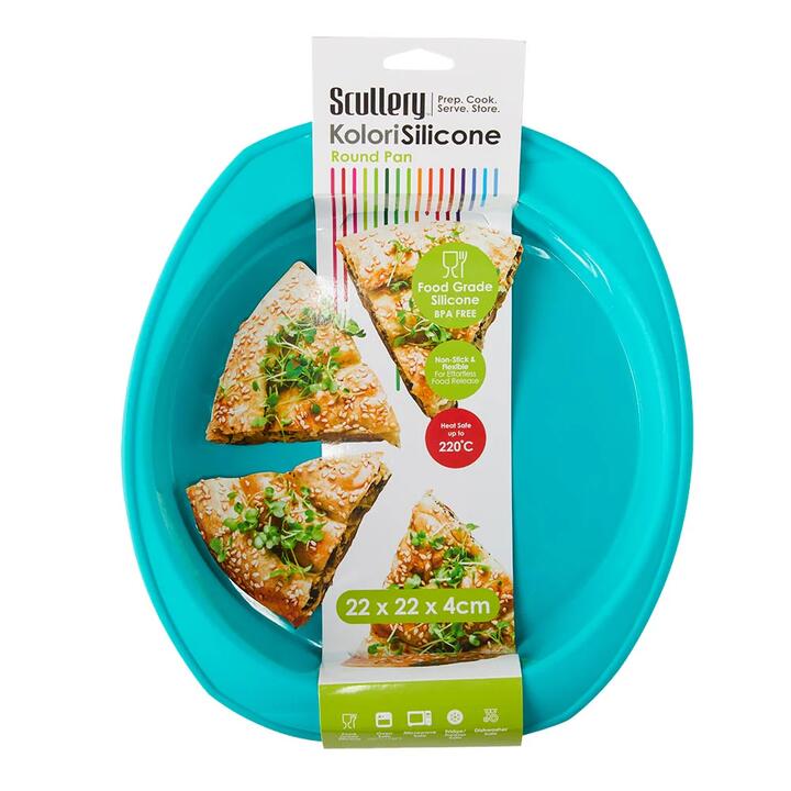Master your baking with the Scullery Kolori Silicone Round Pan 22cm Teal. It is a premium and quality addition to your bakeware collection, designed to withstand daily use. Made from quality silicone for lasting durability and performance, the superior non-stick cooking surface allows for the easy release of food and convenient cleaning. The pop of colour adds vibrancy to any kitchen aesthetic and is fantastic for baking cakes, pies, quiches, or any other savoury treats. Mix and match with other Scullery Kolori pieces for the ultimate colourful kitchenware collection. Features• Silicone construction for durability and performance • Non-stick surface for easy realse of food • Lightweight and reusable • Dishwasher safe • Mix and match with other Scullery Kolori piecesMaterials• SiliconeDimensions• 22 x 22 x 4cm
