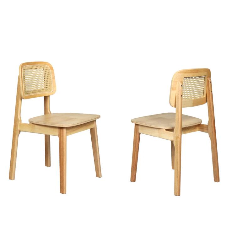 DESCRIPTION, Experience comfort and style with this set of 2 Cane Rattan Dining Chairs. Perfect for dining or hosting events, these chairs are characterized by their solid wood construction and a breathable cane rattan back that offers a unique blend of rustic and modern aesthetics. Feel the embrace of the solid curved wood seat and the sturdy architecture that's designed to hold up to 200kg. static weight. Add a touch of elegance to any space, be it a dining room, restaurant, or event venue. These armless chairs are not just functional they enhance any decor with a natural, timeless charm. They come with felt glides to protect your hard flooring surfaces. Easy assembly and upkeep make these chairs a must-have addition for those who value both utility and style. Key features, Solid rubber wood, Comfy chair, 200kg capacity, Rattan weave, Spacious seating space, Stable reinforced frame, Suitable for log, retro, nostalgic, folk, Scandinavian, natural, warm, Wabi-sabi style, SPECIFICATIONS, Brand: Levede, Frame material: Solid wood, Capacity: 200kg, Seat length: 43cm, Seat depth: 40cm, Dimensions: 50cm x 45cm x 79cm (W x D x H), Colour: Natural, PACKAGE CONTENTS, 2 x Levede Dinning Chairs, 1 x Instruction Manual. Note:- Actual product colours may vary due to lighting, studio photography, room conditions, different screens on various devices. – All our furniture product are flat pack (assembly required) for safe handling purposes.