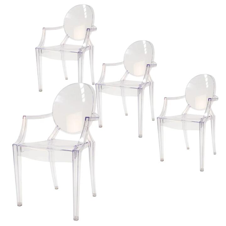 Our stunning Philippe Starck Replica Louis Ghost Dining Armchair is rightly fir for a king, retaining the timeless sophistication of 18th Century France in a contemporary chair. This baroque style armchair has smooth lines and is produced from a single injection mould of polycarbonate. It is weather resistant as well as stackable for easy storage. Features, Injection moulded polycarbonate, Weather Resistant, Commercial grade, Stackable for easy storage, Dimensions, W 54cm X D 57.5cm X H 92.5cm, Seat Height: 48.5cm, Arm Height: 68cm, Dispatch Timing, Normally dispatched within 3 business days, Notes, This item is not applicable for change of mind policy. Note:- Actual product colours may vary due to lighting, studio photography, room conditions, different screens on various devices. – All our furniture product are flat pack (assembly required) for safe handling purposes.