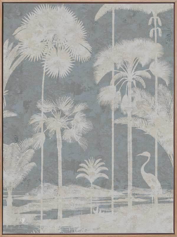 Shadow Palms Blue II Canvas Art Print – Just as the sun rises with its soft, gentle light, wildlife begin to stir, basking in the warm, early rays. This gorgeous piece focuses on simplicity with a subdued, monotone colour palette and limited details, leaving an array of shadow figures, allowing the aged texture to overlap each silhouette for a timeless feel. With its pale blue and cream white palette, Shadow Palms is striking, yet delicate on the eye, making it the perfect feature piece for any interior. Bethany Linz brings her timeless touch to Urban Road, with incredibly intricate, detailed pieces inspired by exotic wildlife and plant life. Bethany is known for her exquisitely hand painted art that's transformed into various textiles, creating an overall vintage look and feel. Many of the pieces in this collection are inspired by Indian summers, conveying warm breezes, buzzing insects, and gorgeous Indian animal studies featuring realistic details and modest compositions. A widespread colour palette focuses on understated tones, from soft pinks, yellows and blues, to rich emerald greens, and plenty of neutral clay shades, which all incorporate beautifully with many interior design styles. Disclaimer: Colours of Urban Road products may vary due to device display differences, monitor settings, inherent product variations, lighting conditions, and screen calibration. While we strive for accuracy, slight variations may occur. For any concerns, contact our customer support. Your satisfaction is our priority. STRETCHED CANVAS Urban Road's stretched canvas fine art prints are professionally printed on polycotton artist canvas, using archival inks and then stretched and gallery wrapped. This means the image is stretched around a 38mm frame to create a seamless, museum-quality finish. All stretched and box framed art prints arrive ready to hang. SHADOW BOX FRAMES We also offer the option to add a shadow box frame to your Urban Road canvas art print. A little different from a traditional framed print, the canvas sits within the box frame with a 5mm gap, creating a sophisticated shadow effect between the frame and the canvas. Our solid timber box frame mouldings are 10mm wide, and 55mm deep, and add approximately 40mm to the length and height of the listed canvas size. ROLLED CANVAS ART At Urban Road, we also offer you the option to purchase your canvas art print unframed to allow you to have it framed your own way. As with our stretched and box framed canvas products, our rolled canvas prints are professionally printed on durable, museum-quality, matte coated polycotton canvas and made to order. Our rolled canvas products are printed to the listed stretched size, and come with an additional 45mm mirrored edge plus another 60mm white border to allow for gallery wrapping.