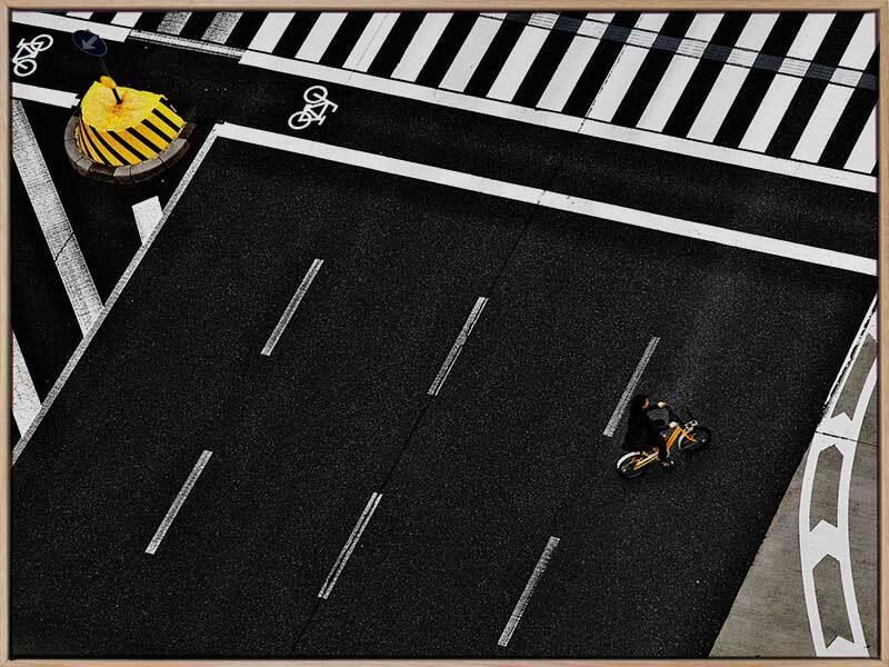 Single Rider Canvas Art Print – A photographic artwork featuring a birds-eye view of an intersection, and a single bicycle rider. THE CURATED SERIES A handpicked gallery of daringly quirky photographic pieces exploding with richness of colour and texture. Disclaimer: Colours of Urban Road products may vary due to device display differences, monitor settings, inherent product variations, lighting conditions, and screen calibration. While we strive for accuracy, slight variations may occur. For any concerns, contact our customer support. Your satisfaction is our priority. STRETCHED CANVAS Urban Road's stretched canvas fine art prints are professionally printed on polycotton artist canvas, using archival inks and then stretched and gallery wrapped. This means the image is stretched around a 38mm frame to create a seamless, museum-quality finish. All stretched and box framed art prints arrive ready to hang. SHADOW BOX FRAMES We also offer the option to add a shadow box frame to your Urban Road canvas art print. A little different from a traditional framed print, the canvas sits within the box frame with a 5mm gap, creating a sophisticated shadow effect between the frame and the canvas. Our solid timber box frame mouldings are 10mm wide, and 55mm deep, and add approximately 40mm to the length and height of the listed canvas size. ROLLED CANVAS ART At Urban Road, we also offer you the option to purchase your canvas art print unframed to allow you to have it framed your own way. As with our stretched and box framed canvas products, our rolled canvas prints are professionally printed on durable, museum-quality, matte coated polycotton canvas and made to order. Our rolled canvas products are printed to the listed stretched size, and come with an additional 45mm mirrored edge plus another 60mm white border to allow for gallery wrapping.