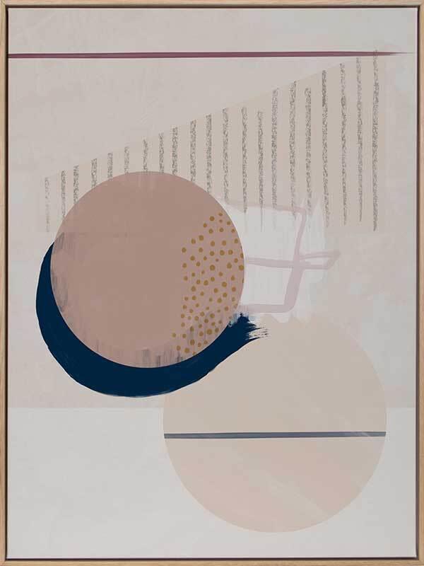 Solace Canvas Art Print: A geometric abstract that balances lines and circles in a blush colour palette. Pairs with Succor. 2018 AUTUMN/WINTER COLLECTION: CONTINUUM Disclaimer: Colours of Urban Road products may vary due to device display differences, monitor settings, inherent product variations, lighting conditions, and screen calibration. While we strive for accuracy, slight variations may occur. For any concerns, contact our customer support. Your satisfaction is our priority. STRETCHED CANVAS Urban Road's stretched canvas fine art prints are professionally printed on polycotton artist canvas, using archival inks and then stretched and gallery wrapped. This means the image is stretched around a 38mm frame to create a seamless, museum-quality finish. All stretched and box framed art prints arrive ready to hang. SHADOW BOX FRAMES We also offer the option to add a shadow box frame to your Urban Road canvas art print. A little different from a traditional framed print, the canvas sits within the box frame with a 5mm gap, creating a sophisticated shadow effect between the frame and the canvas. Our solid timber box frame mouldings are 10mm wide, and 55mm deep, and add approximately 40mm to the length and height of the listed canvas size. ROLLED CANVAS ART At Urban Road, we also offer you the option to purchase your canvas art print unframed to allow you to have it framed your own way. As with our stretched and box framed canvas products, our rolled canvas prints are professionally printed on durable, museum-quality, matte coated polycotton canvas and made to order. Our rolled canvas products are printed to the listed stretched size, and come with an additional 45mm mirrored edge plus another 60mm white border to allow for gallery wrapping.