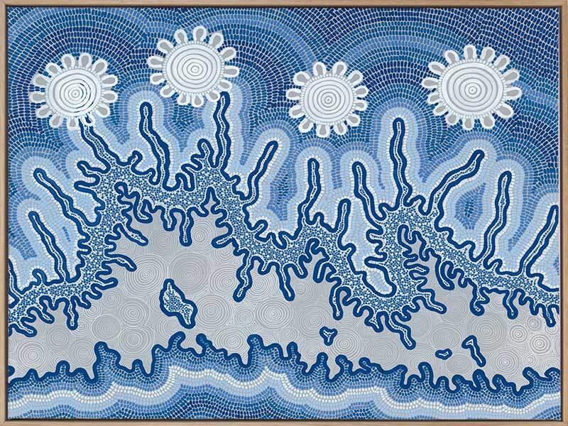 Spiritual Connection Blue Canvas Art Print – This exquisite Aboriginal Wall Art brings a lively, playful energy to your space with a dynamic design of curved lines, spirals, and dots, created using traditional Aboriginal Art techniques. With a simple colour palette of soft light and dark blue shades, this art print is easy to merge with any interior style. A piece of modern Aboriginal Art, this work showcases the remarkable talent and cultural heritage of a skilled local Aboriginal Artist, making it a true embodiment of Indigenous Artistic expression and storytelling. Urban Road is committed to investing a stream of ongoing financial support back to our Artist community. For every artwork sold, a percentage of the sale price goes directly back to the Indigenous Artist. Bringing you a brand-new range of traditional Aboriginal art for sale, the sixth instalment to our Aboriginal wall art Australia collection takes an intricate look at Dreamtime storytelling by several coveted Aboriginal artists. Each of these modern Aboriginal artworks have their own story and meaning, with the artists drawing on upon their personal life experiences, exuding strength, resilience, and a profound sense of connection. Immerse yourself in a vibrant spectrum of colours, from bright and warm to subdued, soft and neutral, making this collection an ideal complement to any interior style. The use of striking patterns and shapes bring a vibrant, moving energy to any room, with the option for a framed canvas print to elevate your space. Buy an Aboriginal artwork online today and honour the Aboriginal culture and the remarkable artistic traditions that have shaped generations. Disclaimer: Colours of Urban Road products may vary due to device display differences, monitor settings, inherent product variations, lighting conditions, and screen calibration. While we strive for accuracy, slight variations may occur. For any concerns, contact our customer support. Your satisfaction is our priority. STRETCHED CANVAS Urban Road's stretched canvas fine art prints are professionally printed on polycotton artist canvas, using archival inks and then stretched and gallery wrapped. This means the image is stretched around a 38mm frame to create a seamless, museum-quality finish. All stretched and box framed art prints arrive ready to hang. SHADOW BOX FRAMES We also offer the option to add a shadow box frame to your Urban Road canvas art print. A little different from a traditional framed print, the canvas sits within the box frame with a 5mm gap, creating a sophisticated shadow effect between the frame and the canvas. Our solid timber box frame mouldings are 10mm wide, and 55mm deep, and add approximately 40mm to the length and height of the listed canvas size. ROLLED CANVAS ART At Urban Road, we also offer you the option to purchase your canvas art print unframed to allow you to have it framed your own way. As with our stretched and box framed canvas products, our rolled canvas prints are professionally printed on durable, museum-quality, matte coated polycotton canvas and made to order. Our rolled canvas products are printed to the listed stretched size, and come with an additional 45mm mirrored edge plus another 60mm white border to allow for gallery wrapping.