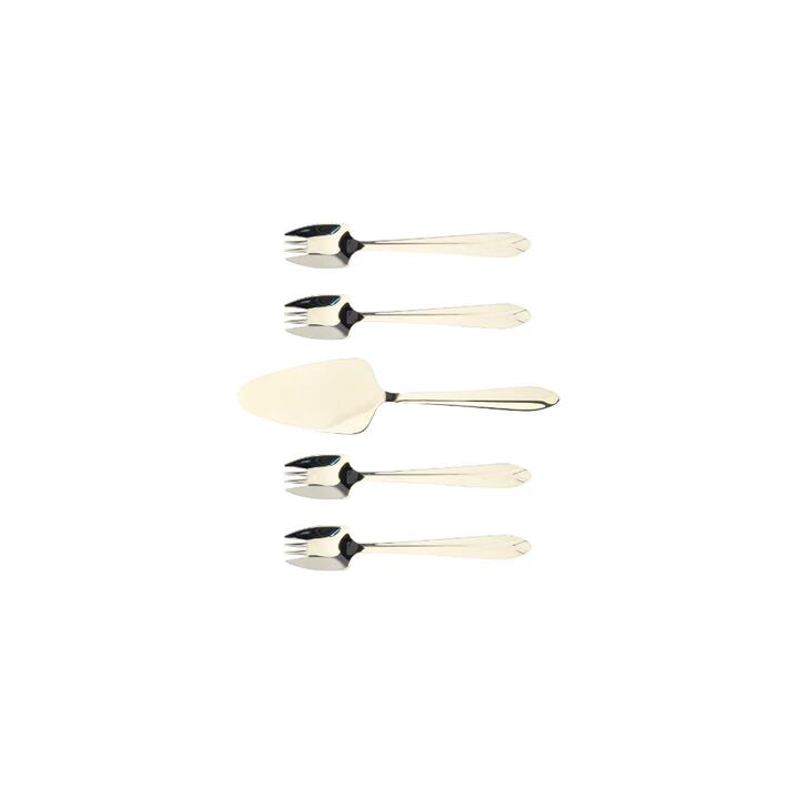 The Splayd Cake Server Set seamlessly blend timeless elegance with innovative functionality, featuring premium stainless-steel construction and a chic, mirror-polished finish. As an iconic Australian brand and invention from the late 1940s, Splayd is renowned for its all-in-one knife, fork, and spoon design, offering a refined and practical solution for serving and enjoying a variety of foods on any dining occasion. Features• The versatile Australian invention – a blend of a knife, fork & spoon ALL IN ONE• 18/8 stainless steel• Perfect 5 piece set for entertaining• Perfect for any occasionWhat Am I Buying• 1 x Cake Server• 4 x SplaydsMaterials Stainless SteelDimensions25.5cm x 3cm x 3cm