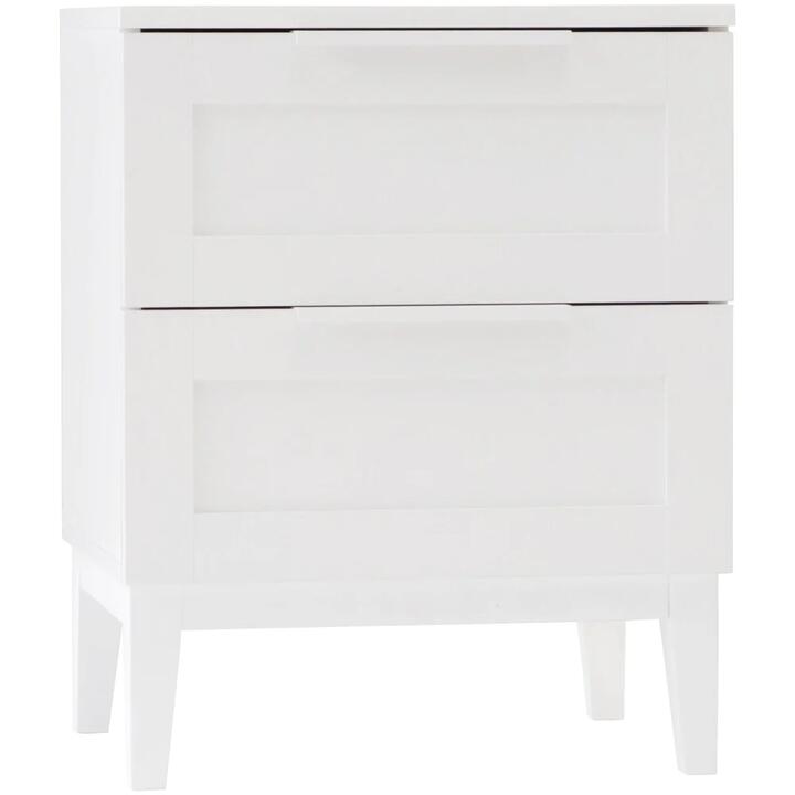 The Stanley 2 drawer bedside table is the perfect bedside table to store your bedroom accessories. Featuring 2 drawers with high quality slider drawer runners, they provide sufficient storage for all your belongings. The 3D scratch resistant Wood-Look Classic White Laminated finish gives a modern fresh look to your bedroom. cooler coordinated powder coated metal handle modernizes this item for classic, yet modern finish Features, Constructed from 15mm particleboard and medium density fiberboard for an enduring appeal, Features 2x full size drawers with metal runners for your blankets or bed time books , Offers scratch resistant 3D Wood grain look and SPU Foil laminated for a long-lasting use, Comes with a metal powder-coated white 20cm handles, Tapered wood leg with white painted finish for an additional durability, Overall Dimensions:, Width: 45cm, Depth: 39.8cm, Height: 56.5cm, Internal Drawer Dimensions:, Width: 37.5cm, Depth: 27.7cm, Height: Front 15.8cm / Side 13.0cm, Drawer Front Panel: 19.6cm, Colour – White Package Contents, 1 x 2 Drawer Bedside Table (with parts included for assembly), 1 x Users Guide & Warranty Certificate, Self Assembly – This product arrives fully flat packed for ease and convenience. Note:- Actual product colours may vary due to lighting, studio photography, room conditions, different screens on various devices. – All our furniture product are flat pack (assembly required) for safe handling purposes.