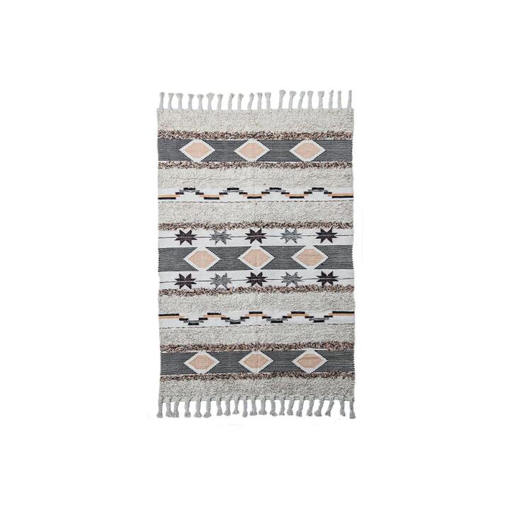 This soft and beautiful rug will make a cosy addition to your interior and is handwoven from 100% pure cotton. Rustic patterned tassel rug, Middle Eastern-inspired design, Made from 100% cotton, Handwoven design, The perfect finishing touch to any room's decor, the Tangier Rug features a stunning repeating geometric pattern in soft, subtle hues and a naturally durable design. Textured cotton, Handwoven using a time honoured loom technique, this rug is made with pure cotton that is naturally hypoallergenic, easy to maintain, durable and, most importantly, soft and cosy on the toes. Stunning symmetry, With a muted colour palette pairing neutral and pastel hues, patterned into a repeating geometric design, this rug will add interest to your decor with a hint of faraway charms. Dimension: 120 x 180 cm. Note:- Actual product colours may vary due to lighting, studio photography, room conditions, different screens on various devices.