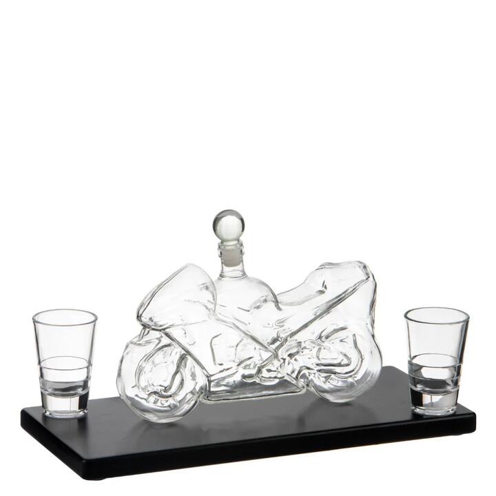 The Tempa Preston Motorcycle Whisky Set is the ultimate accessory for motorcycling enthusiasts, featuring a decanter in the shape of a motorcycle and two sleek shot glasses set on a stylish black board. This unique set combines passion for the open road with the enjoyment of fine whisky. Features• Features a unique motorbike-shaped glass decanter • Includes two clear whisky shot glasses • Perfect gift for motorcycle enthusiasts and collectors • Compact and sturdy design What Am I Buying• 2 x Whiskey Glasses • 1 x Motorbike Decanter• 1 x Tray Materials Borosili/MDF/Crystal